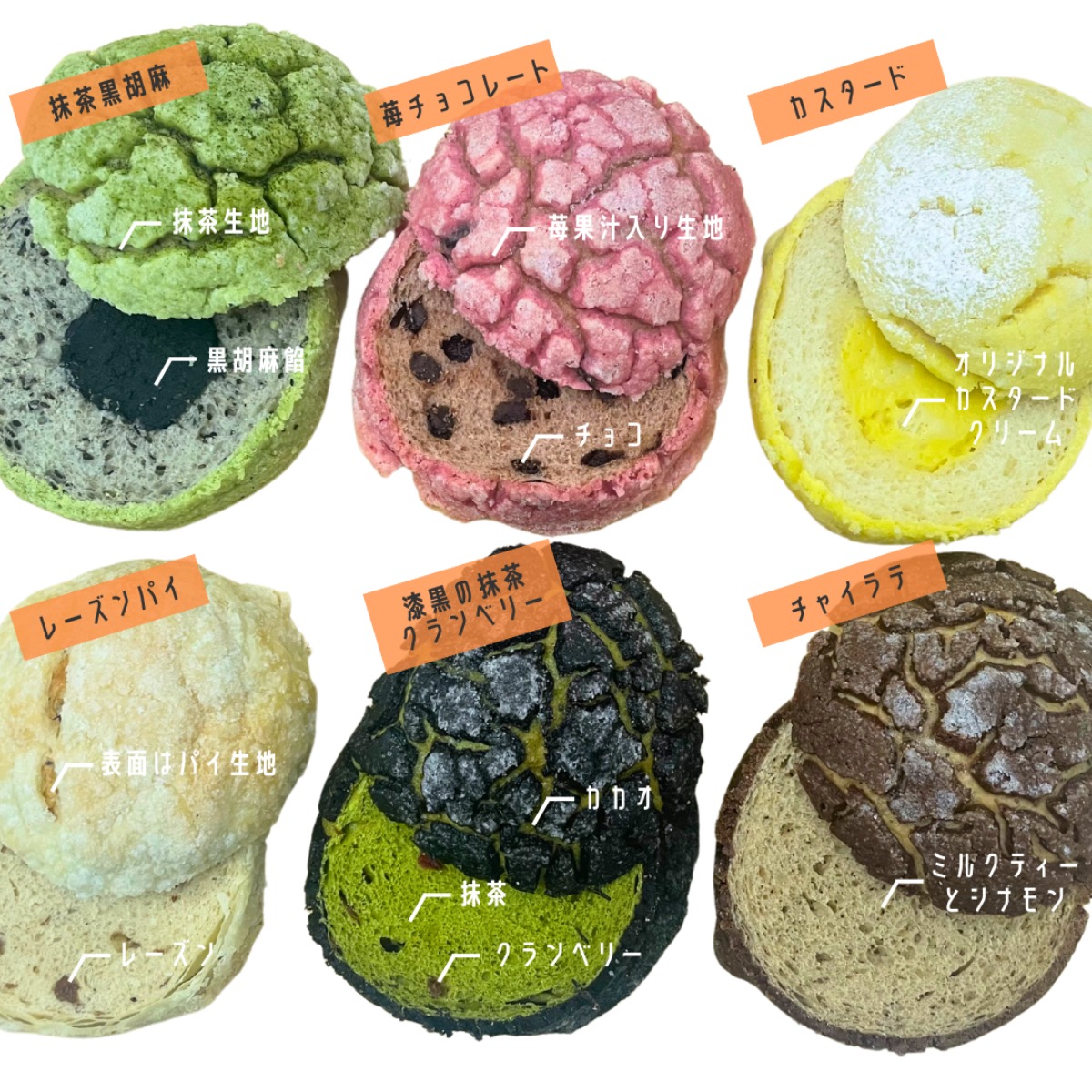 写真左上からチャイラテ、抹茶黒胡麻、レーズンパイ、苺チョコレート、漆黒の抹茶クランベリー、カスタード各390円(税込)