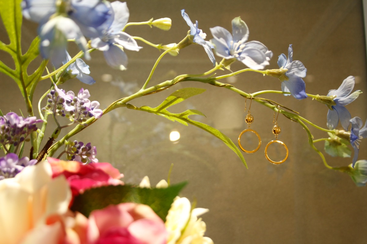みかんの花「ネロリ」をデザインしたピアスやシンプルな丸形ネックレスなどを販売。