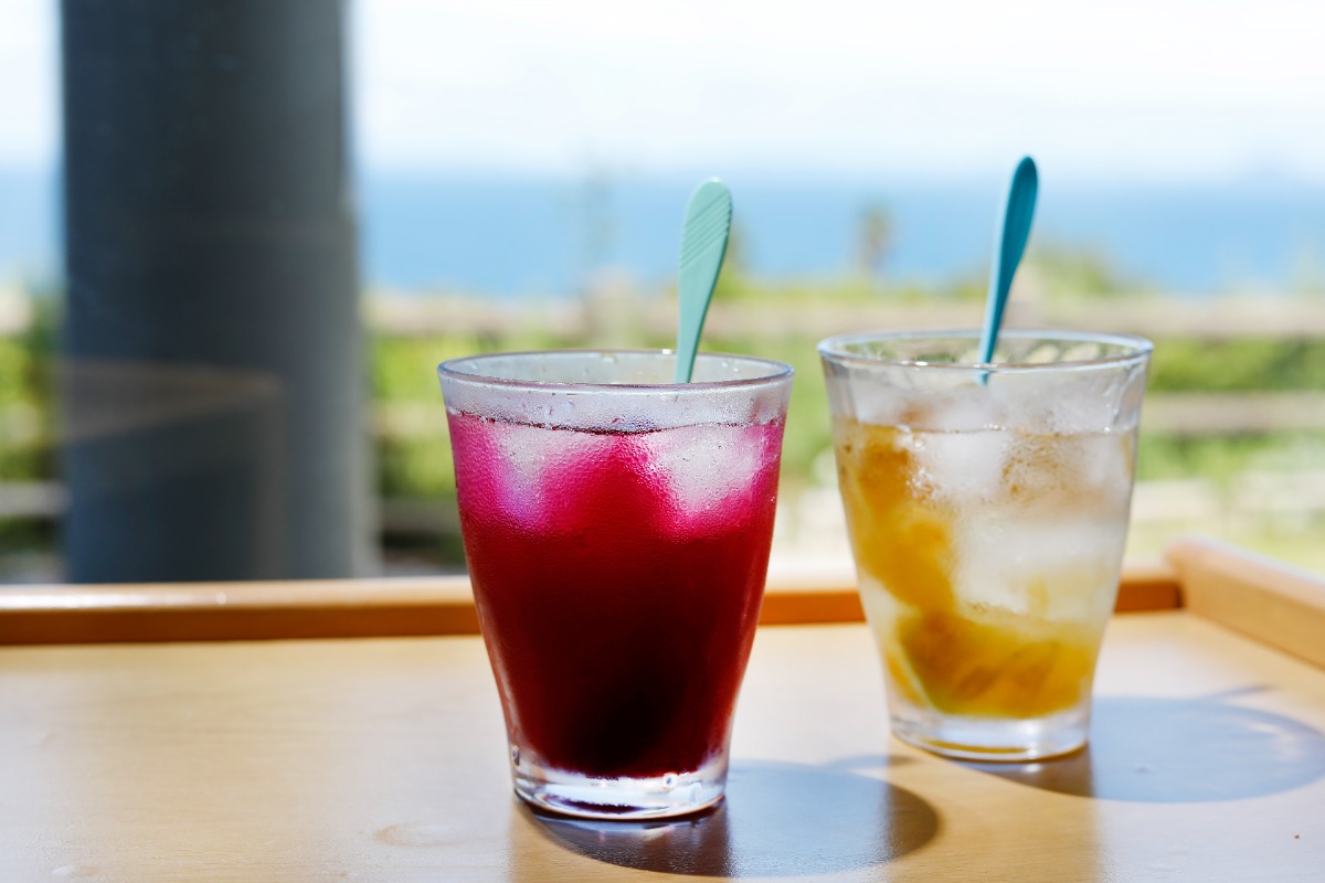 公園内で採れたものも使ったシソや梅のジュース(各100円)も人気。ドライブついでに立ち寄ってみて!