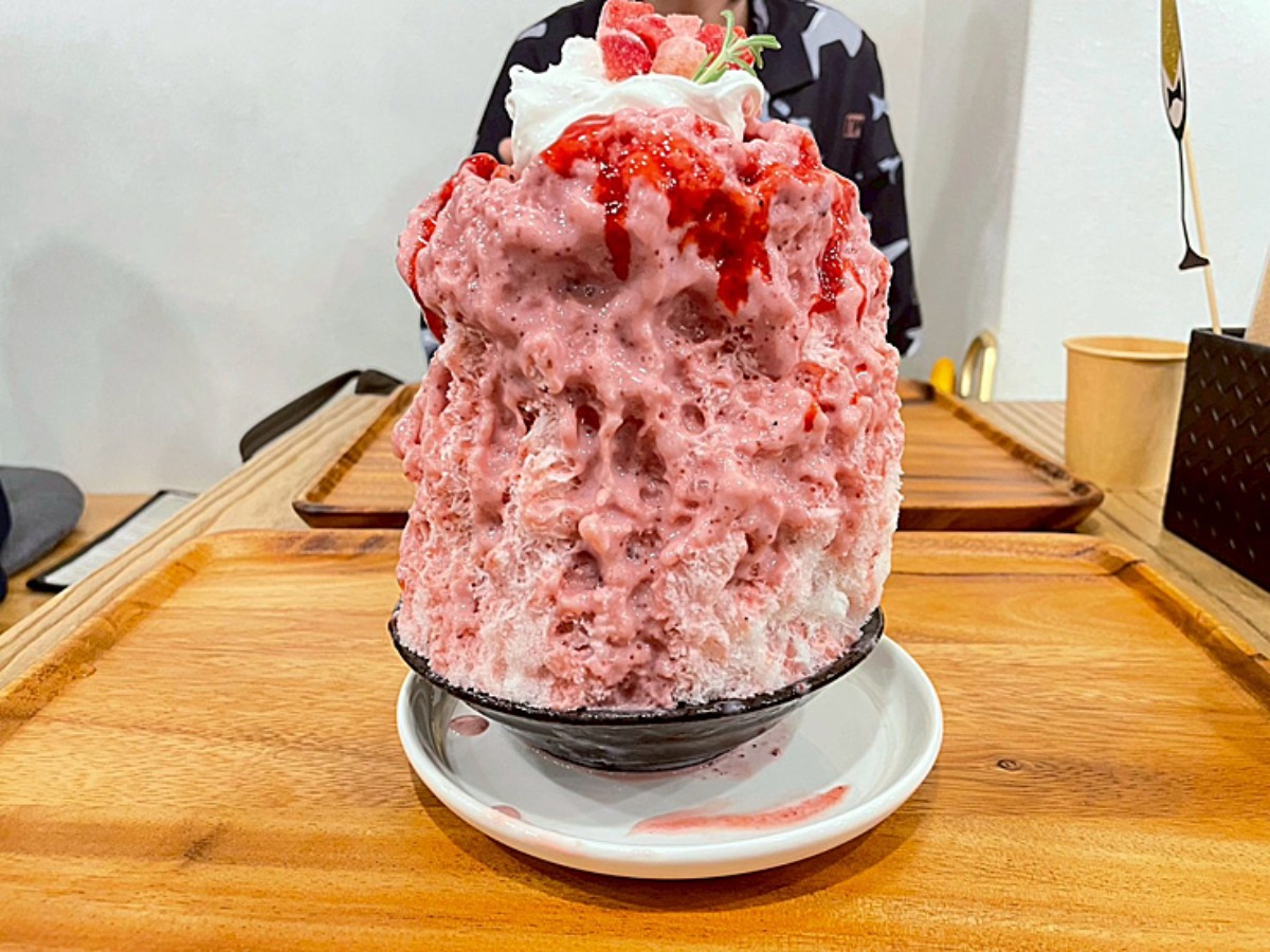 ふんわりこんもりと高く盛られたピンク色の氷はまるでスイーツのアート作品のようです。