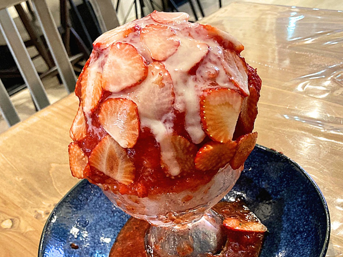 山盛りのかき氷の上に、スライスされたいちごがこれでもか!というくらい散りばめられた、圧巻のビジュアルです。