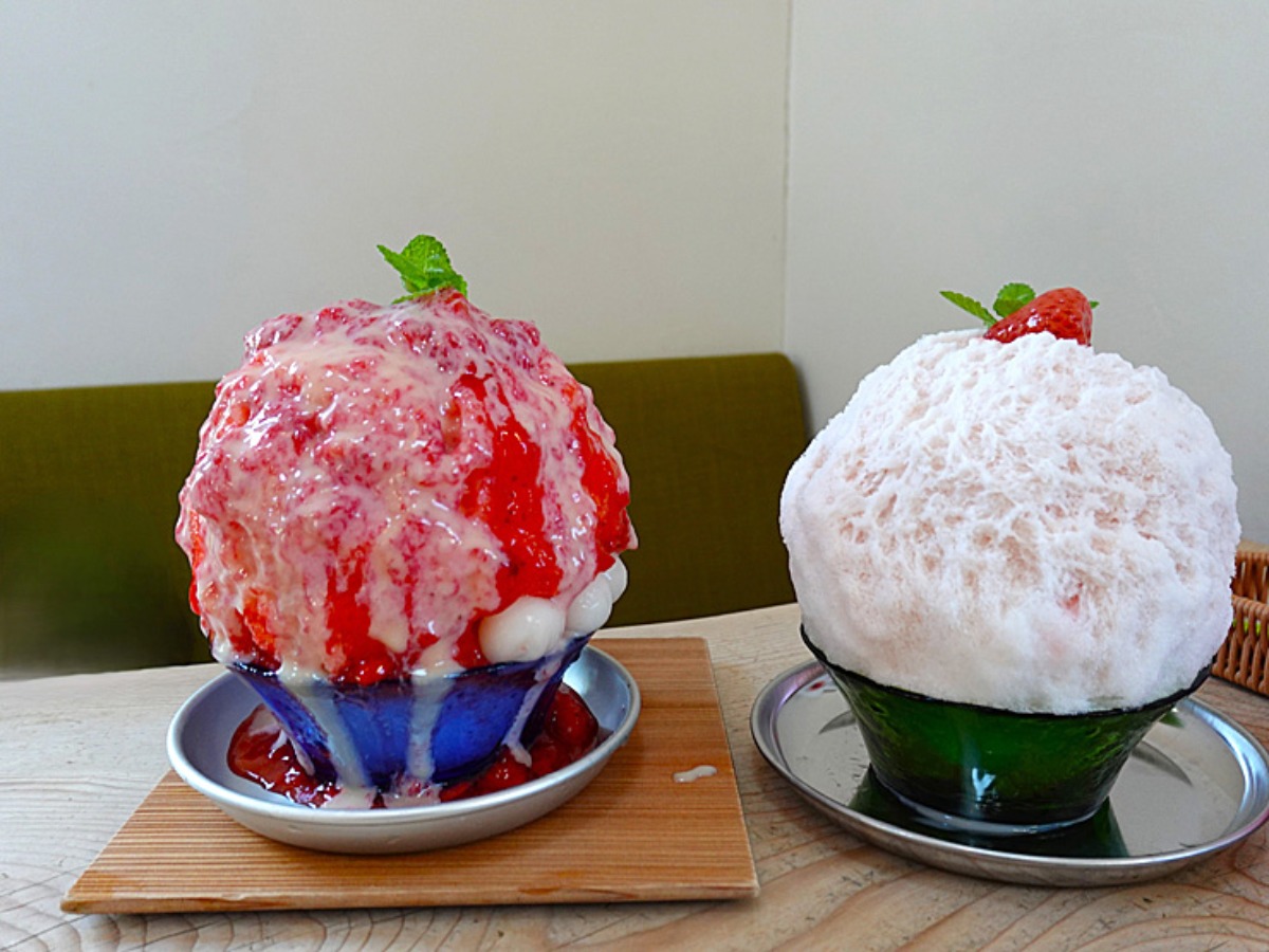 左の「いちごのかき氷」は甘さ控えめで、いちごの甘酸っぱさが口いっぱいに広がります。