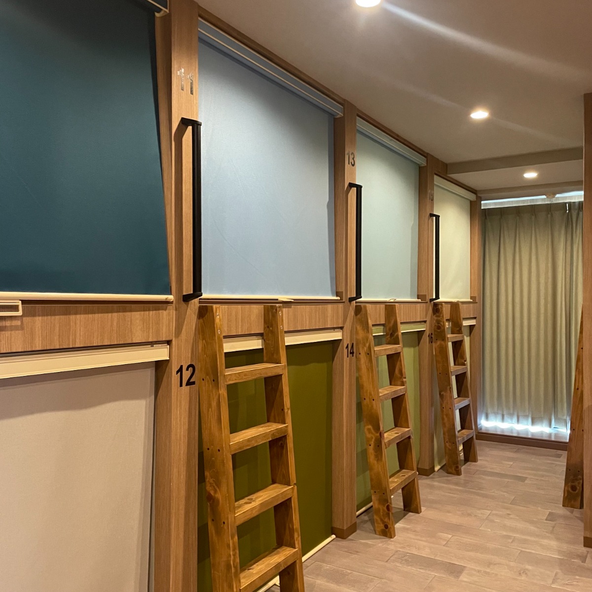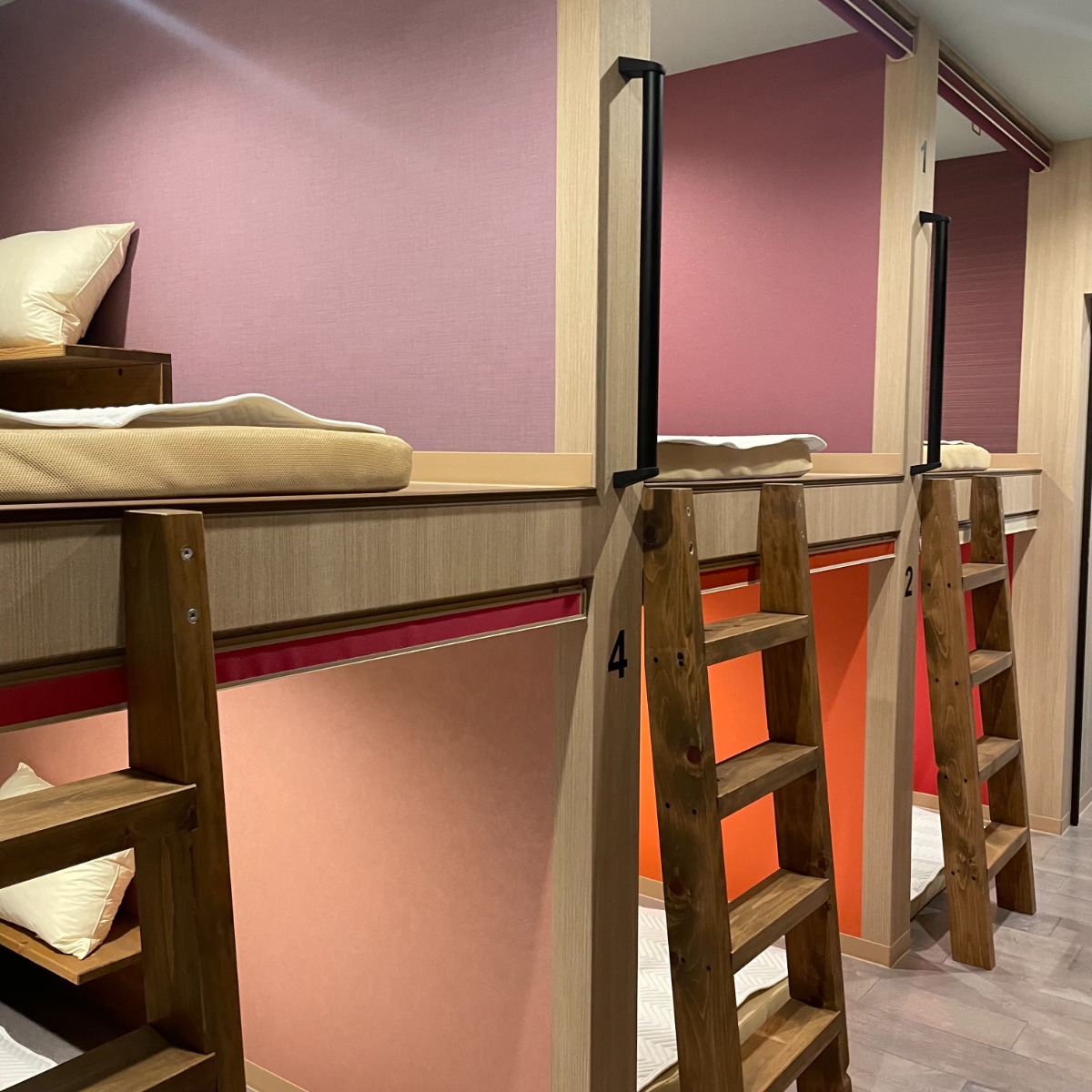 ドミトリーは男性12人部屋、女性6人部屋と定員が以前の半数になり、広く快適に。色とりどりな壁がお洒落。女性ドミトリーは明るい暖色系の色違いの壁が可愛いです。