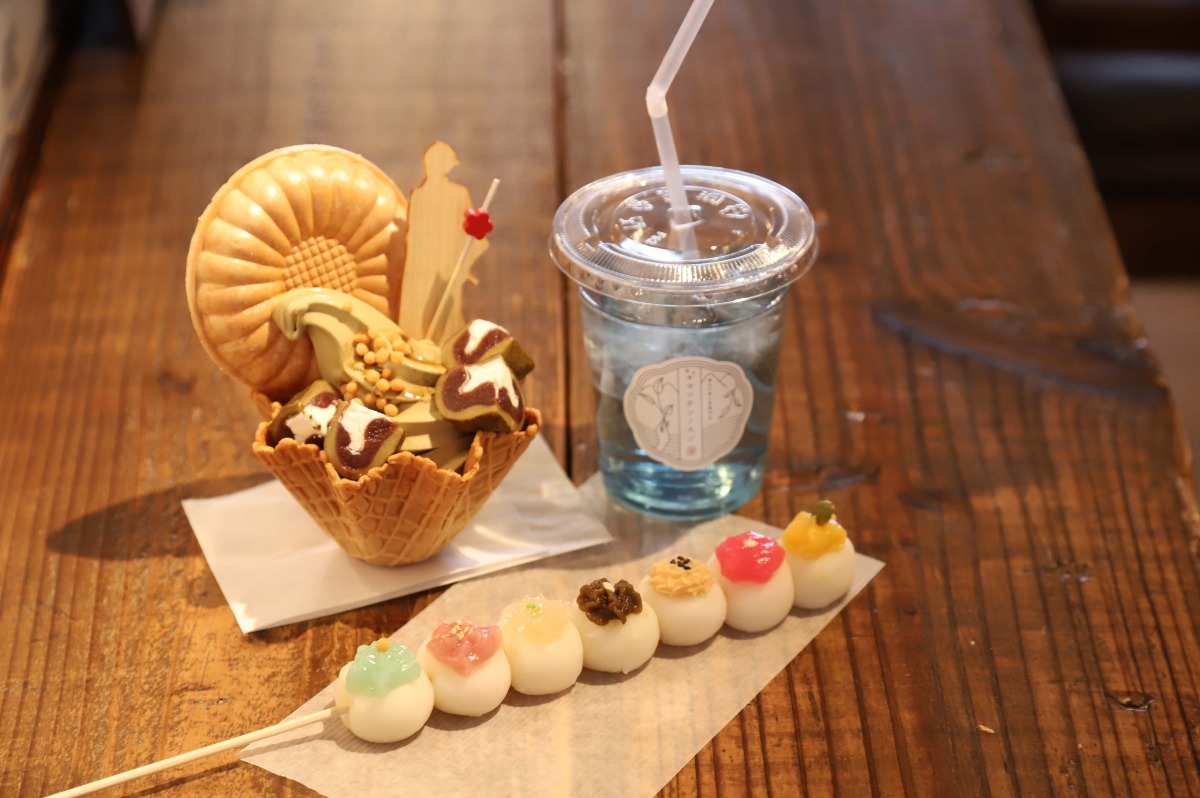 津野町産の焙じ茶を使った大福やソフトクリームにロールケーキといった香りを愉しむスイーツが揃う焙じ茶専門店。柚子、苺、焙じ茶など7種類の餡を団子にのせた「爛漫花団子」やレモンの風味が効いた色鮮やかなハーブティーなど、桂浜公園限定の甘味も要チェック!