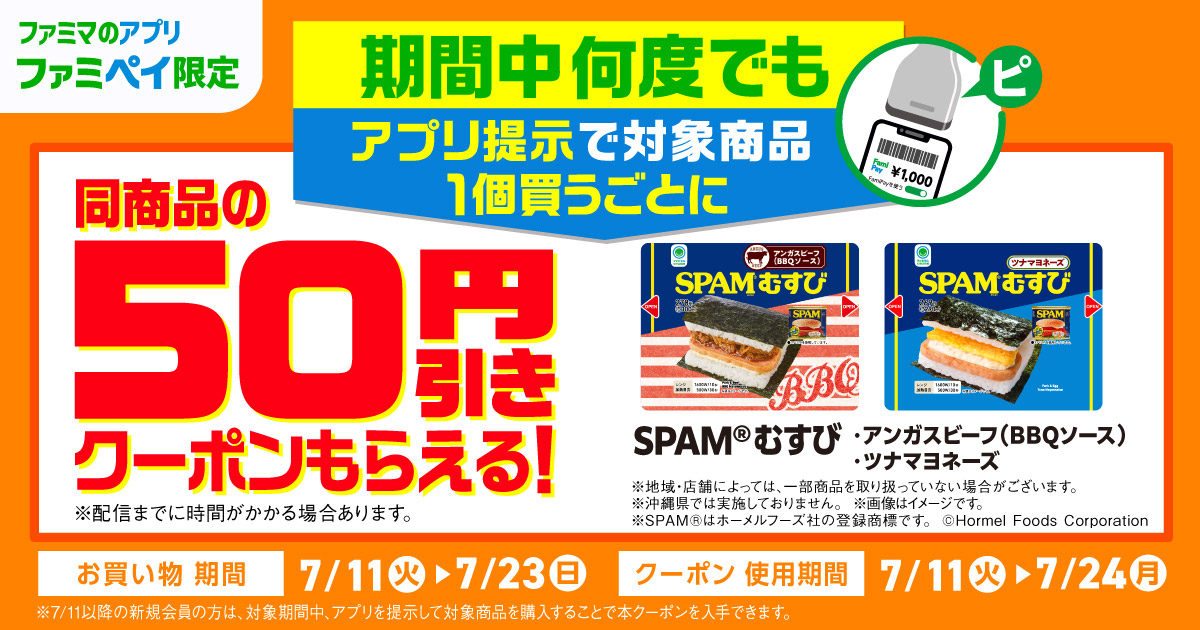 【ファミマのアプリ ファミペイ限定】割引クーポン(対象のSPAM®むすび2点)必ずもらえる!対象商品のお会計時にファミペイを出すだけ!