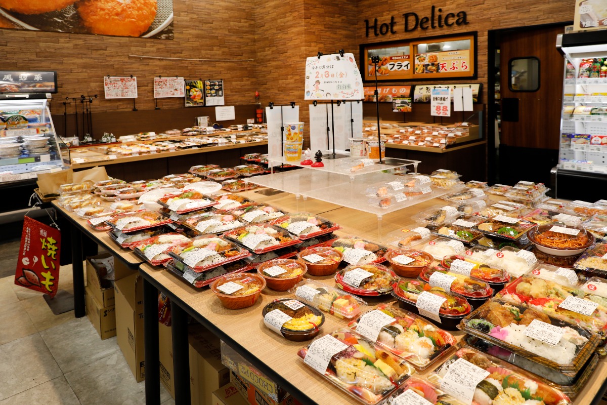 三津店のデリコーナーに並ぶ商品は、大きく分けて2種類。店内で調理した唐揚げや天ぷらと、こだわって仕入れた弁当や丼ものだ。特に店内厨房スタッフが心を込めて手作りする「いなり寿司」は密かにファン多数。店内の照明に当たり、きらきら輝くおかずに心躍ること間違いなし。