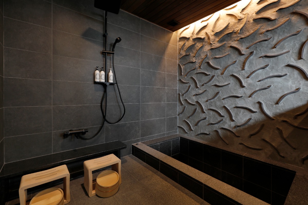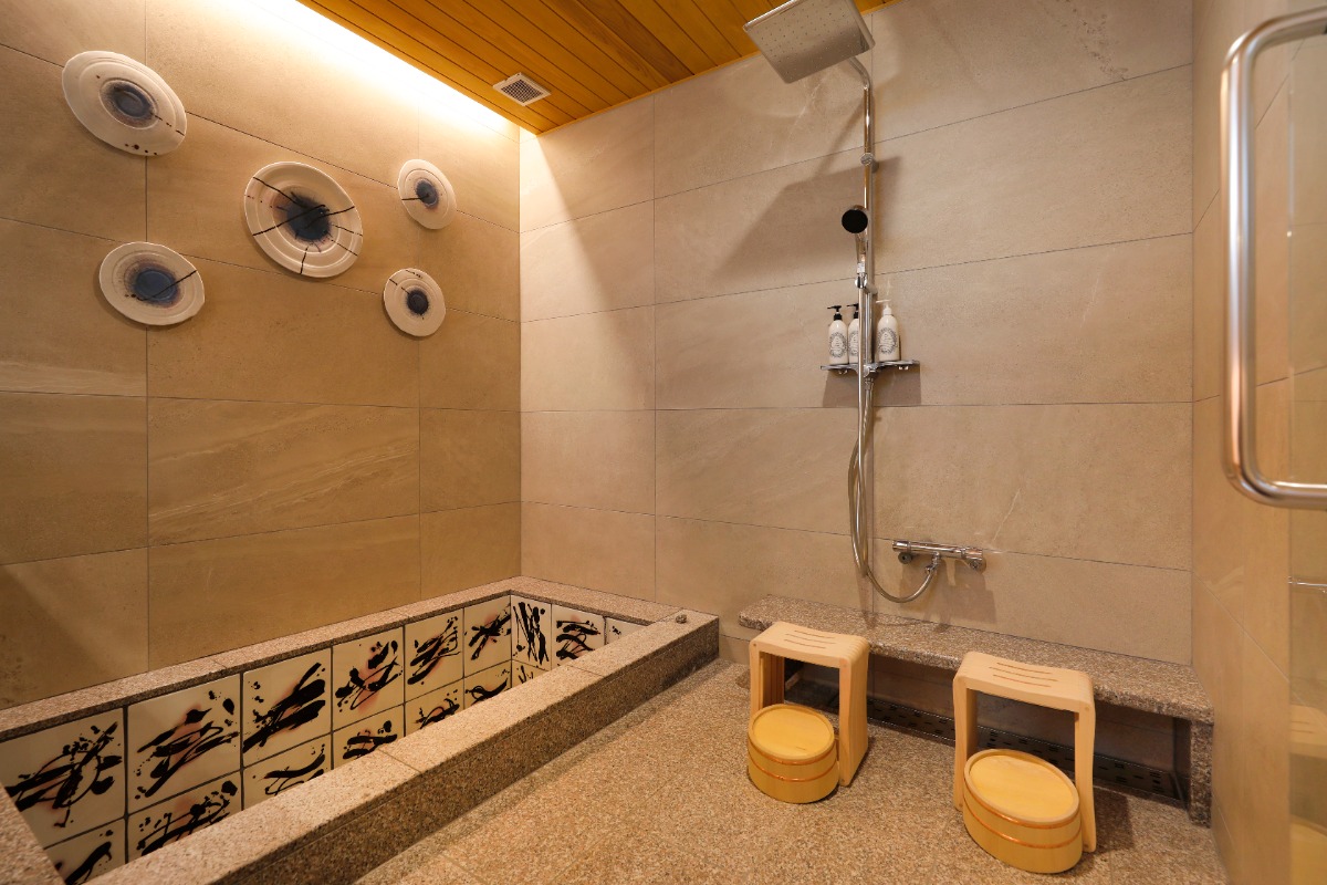 砥部焼の浴室や壁掛け。こちらの砥部焼は、地熱やパッションを表しているそう。高濃度炭酸泉の湯を導入していますよ。