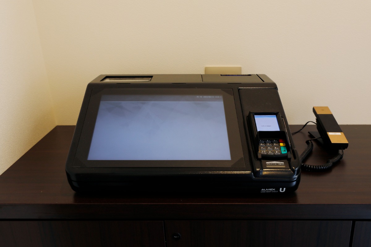 ウェルカムドリンクには県産みかんのジュースを用意してくれます。まさに愛媛尽くしの旅館!受付カウンターにはセルフチェックインシステムを導入