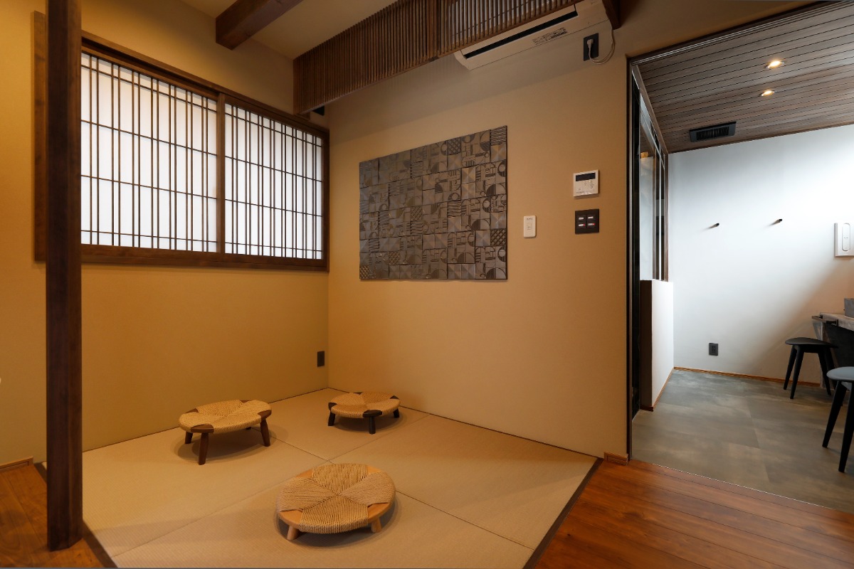 「はるか」は、菊間瓦と竹細工であしらった部屋。竹細工は、愛媛とお客さんとの縁を感じられるように、円が広がっていくイメージで作られているそう。