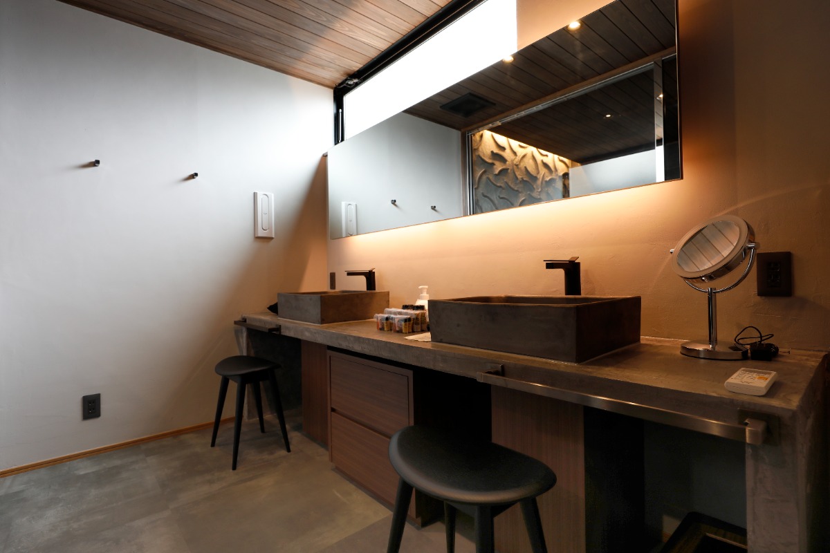 手洗い鉢も砥部焼。愛媛県産シルクを使用したバスグッズやブランド柑橘のハンドソープもありますよ。