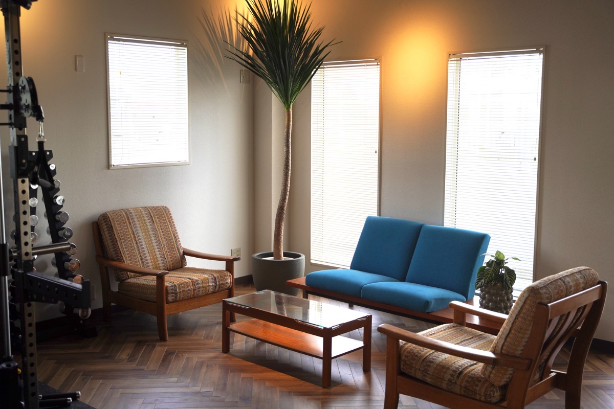 「日本一居心地が良いジム」を目指し、家具、ライト、植物などインテリアにこだわり、厳選したものを配置しています。天井の色は、仰向けになったときに副交感神経を優位に働かせるためダークブルーを採用。また自律神経をコントロールするため「香り」にも注目。活発に動きたいときはシトラス系を、リラックスしたいときはウッド系のアロマを用いて、臭覚からもアプローチをしていきます。