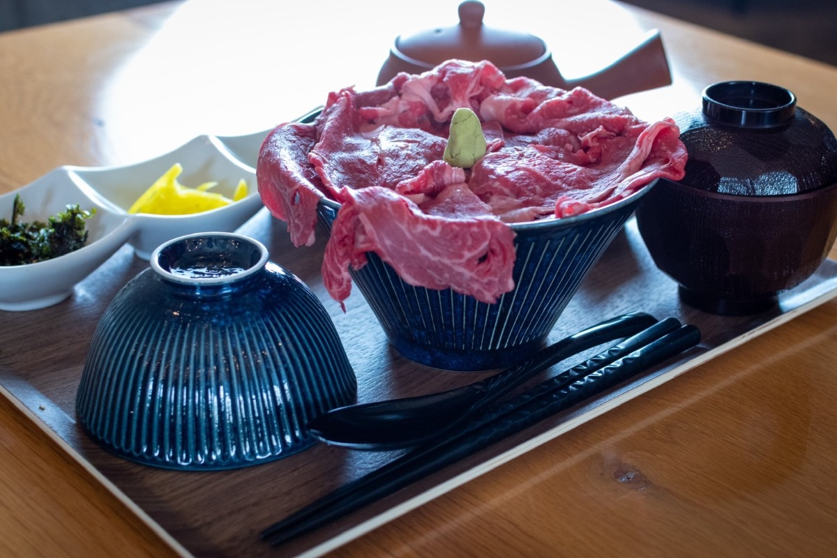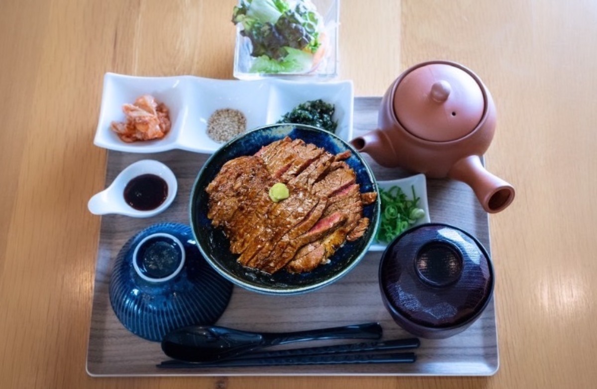国産牛の肩ロースの肉がたっぷり入った「肉まぶし」。片面はしっかり焼いて、もう片面はミディアムレアの状態で提供。脂身が少なくさっぱりと味わえます。もし、しっかり焼いて欲しい人は、注文時に依頼すると要望に応えてくれるのも嬉しいポイント。他にも味噌汁・サラダ・デザート・ドリンクが付いてとてもボリューミーな内容です。