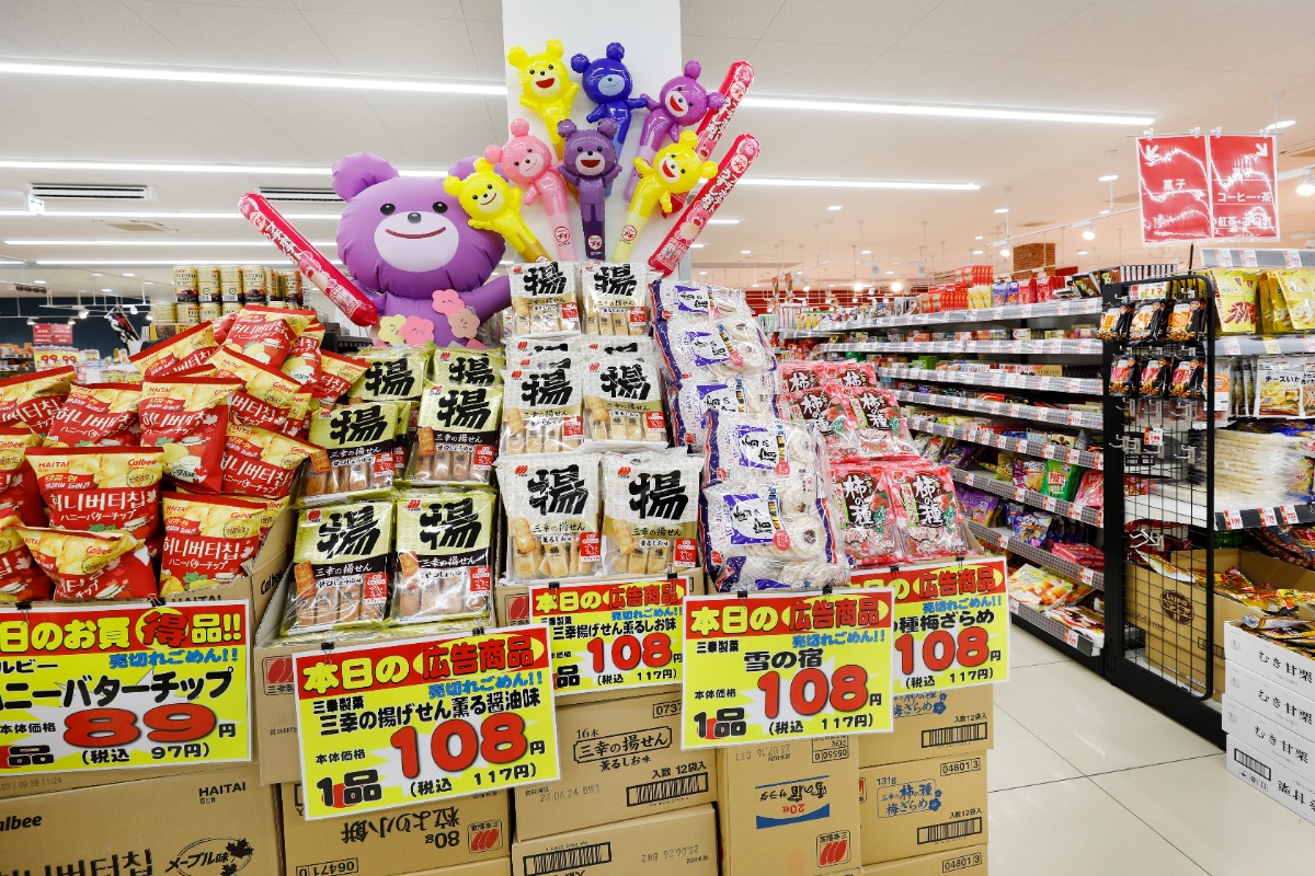 ダイナミックな陳列は、まさに「スーパー日東」名物。どの売り場も商品が盛りだくさんで、ワクワク気分にさせてくれる。たっぷりサイズでお得感満点の袋菓子は、大家族や買い置きしておきたい消費者の心を鷲掴み。この日も、開店直後から老若男女が大勢詰めかけ、祭りのような賑わいに!