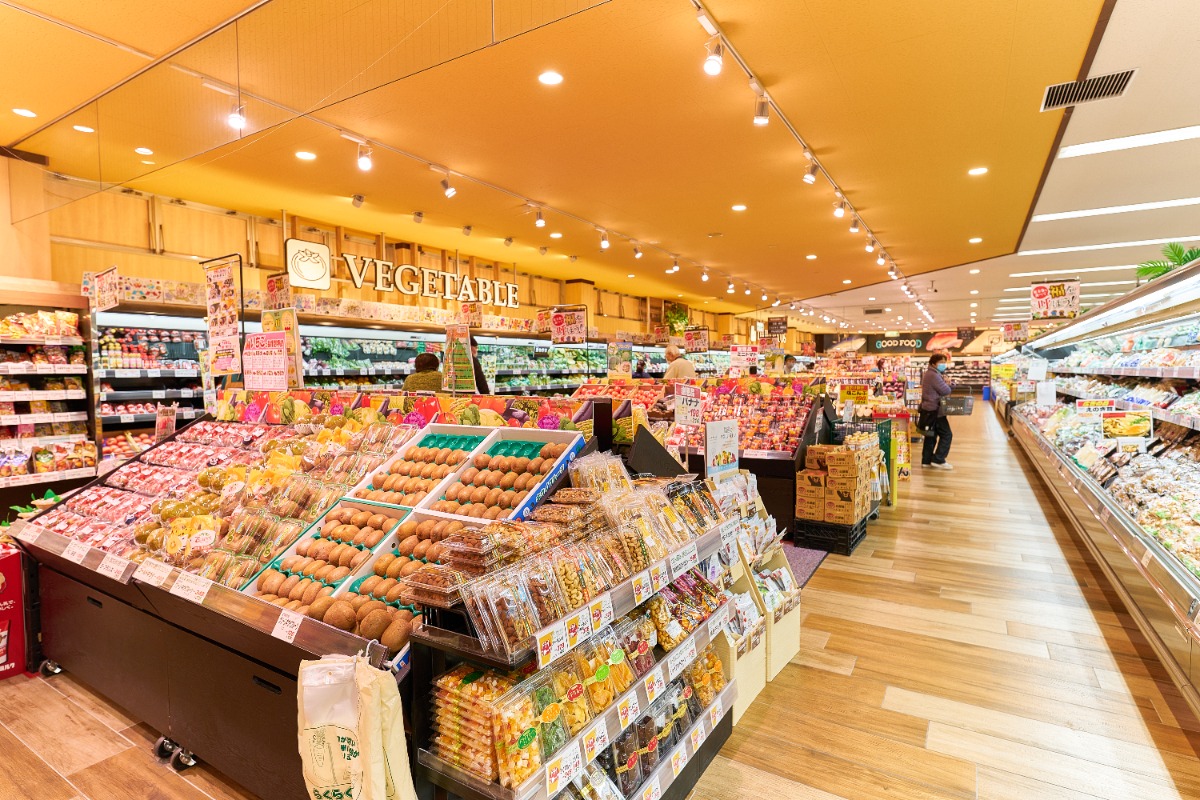 正面から店に入るとすぐに目に入る青果コーナーの野菜や果物。旬の野菜や果物が並ぶ売り場には、コーナー担当者の商品への思い入れが感じられる販促物や展示のアイデアがたくさん。ちなみに、取材した日は「甘平までの歩数」と書かれた看板と、床には売り場まで案内する矢印が書かれていた。