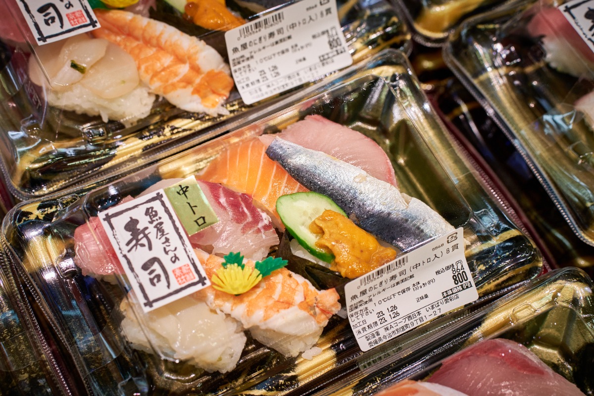 愛彩の水産部門が担当する寿司や刺身は、今治近海で獲れたネタを多く使っており「鮮度が抜群!」とファンも多い。人気の「魚屋のにぎり寿司」は、8貫864円、10貫972円。夕方以降になると売り切れてしまうことも多いため、可能なら9時のオープンと同時に買いに訪れるのがベター。