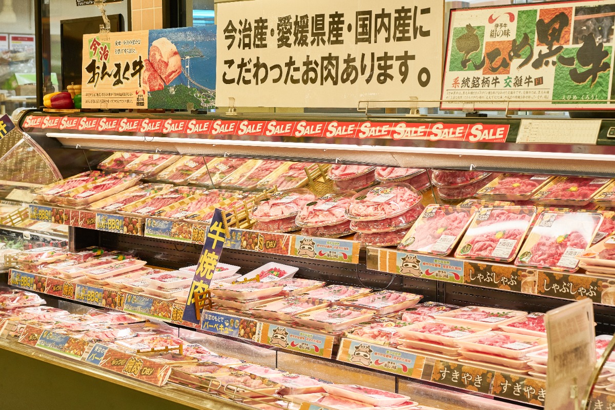 「肉といえば愛彩!」と言われるほど、そのブランド力には信頼感がある愛彩の精肉部門。オススメの肉は「伊予牛 絹の味」の中でも、今治でしか育てていない「今治おんまく牛」。今治では愛彩でしか買えないレアなブランド牛で、最上級のA5ランクは霜降りがたっぷり入って柔らかくジューシー。