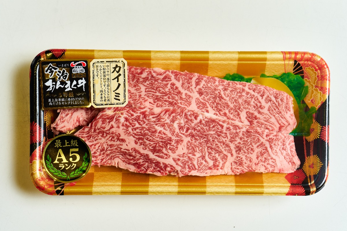 「今治おんまく牛」最上級A5ランクのカイノミ(1,923円)。中バラの一部でヒレに近い特撰部位