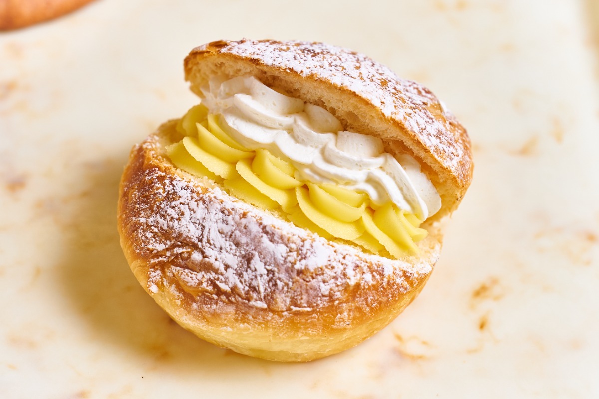 デニッシュ生地にカスタードとホイップがのった定番人気のパン。スノーマウンテン(192円)