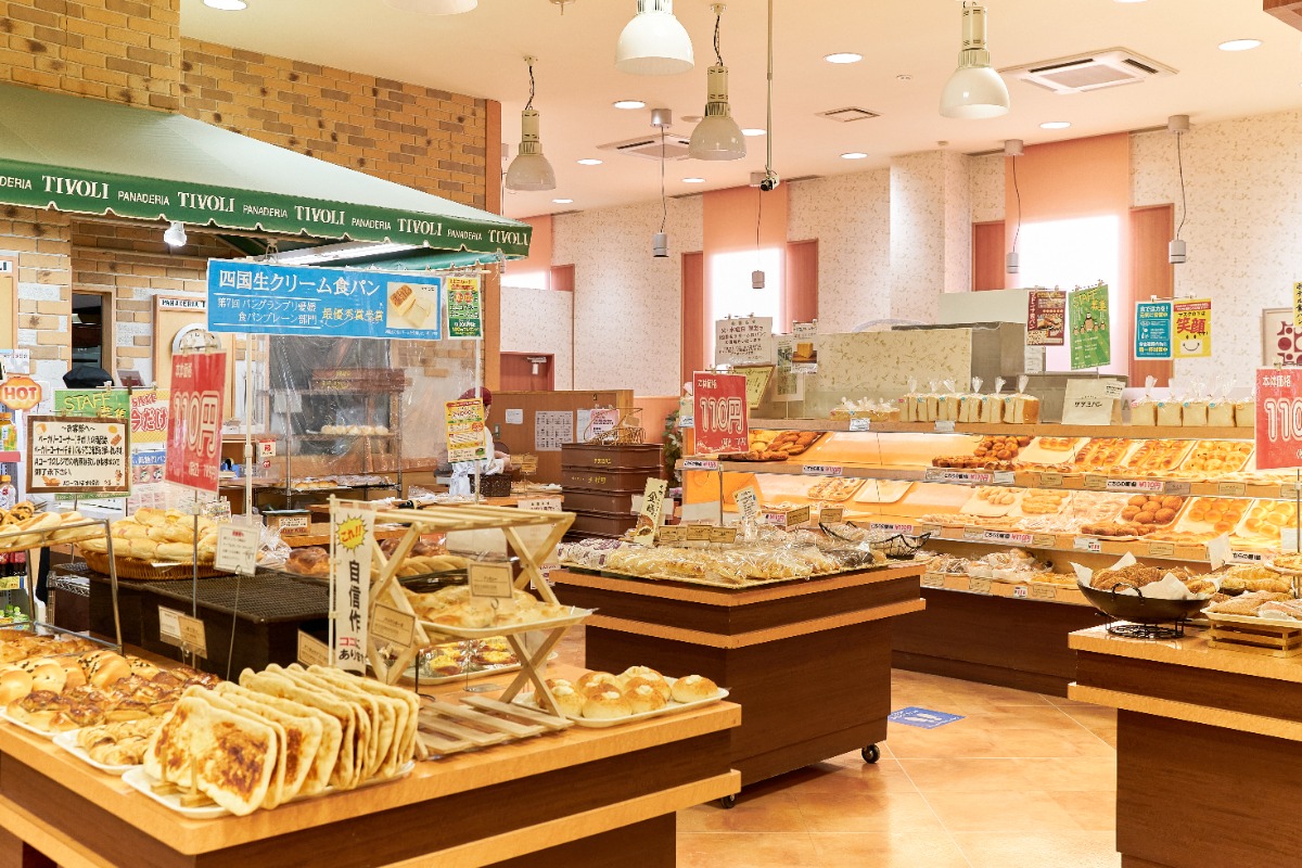 店内併設のベーカリー「パナデリア・チボリ」は、看板パン・四国生クリーム食パンで「第7回パングランプリ愛媛」食パンプレーン部門で最優秀賞を受賞した店(四国生クリーム食パンの販売は火・木曜のみ)。20年間、地元で愛され続けた同店には、ほかにも焼きたての菓子パンや惣菜パンが並ぶ。