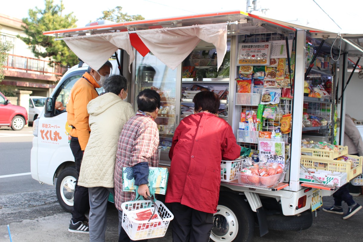 旧東予市、旧丹原町、旧小松町、旧朝倉村、旧玉川町と今治市の一部地域を訪問している移動スーパー「とくし丸」も展開。生鮮食品や惣菜、日用品など300品目のアイテムを軽トラに積み、近くに店がない山間部、免許を返納した高齢者、介護や育児に忙しい人の家に一軒一軒訪問している。