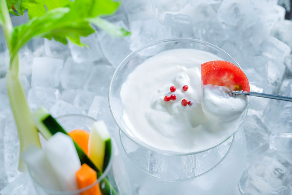 “新感覚”の「冷製チーズフォンデュ」は、冷たいのにチーズが固まらず、とろとろでなめらかな口当たりとさっぱりしたクリーミーさがたまらない新メニューです。