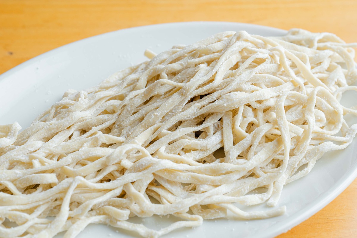 スープに合うよう、新たに製麺された平打ち麺は、つるっとした喉越しの滑らかさが特長です。