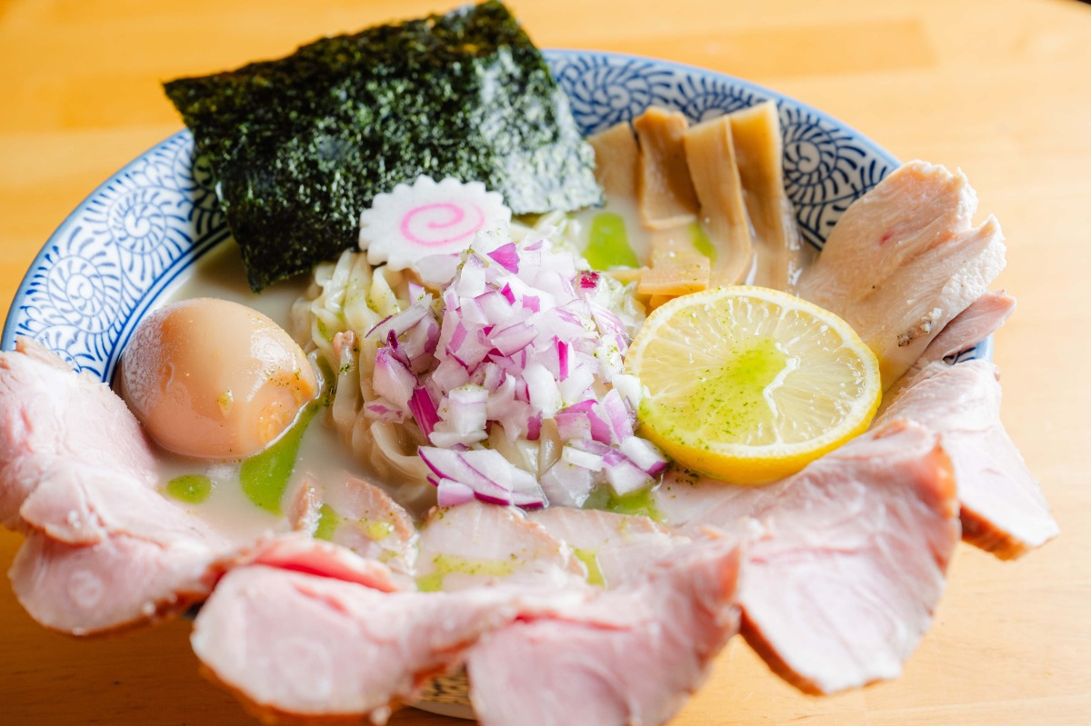 しっとり食感のローストポーク5枚(400円)と、味の染み込んだ店自慢の味玉(100円)をトッピングするのが店主のおすすめ!