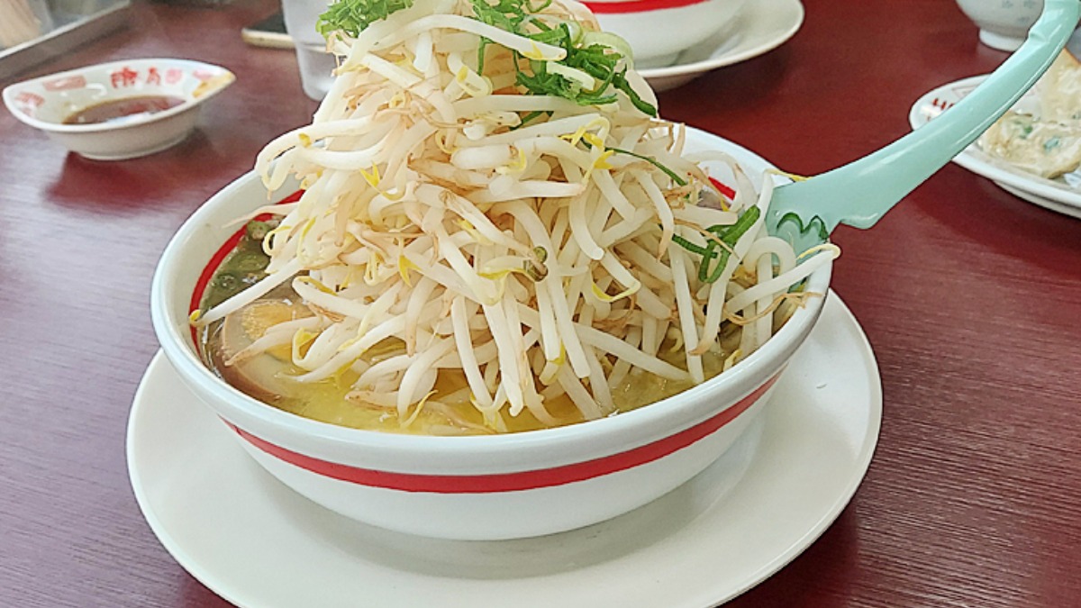 食べごたえある太麺と魚粉を混ぜた店自慢のとんこつスープが相性抜群。