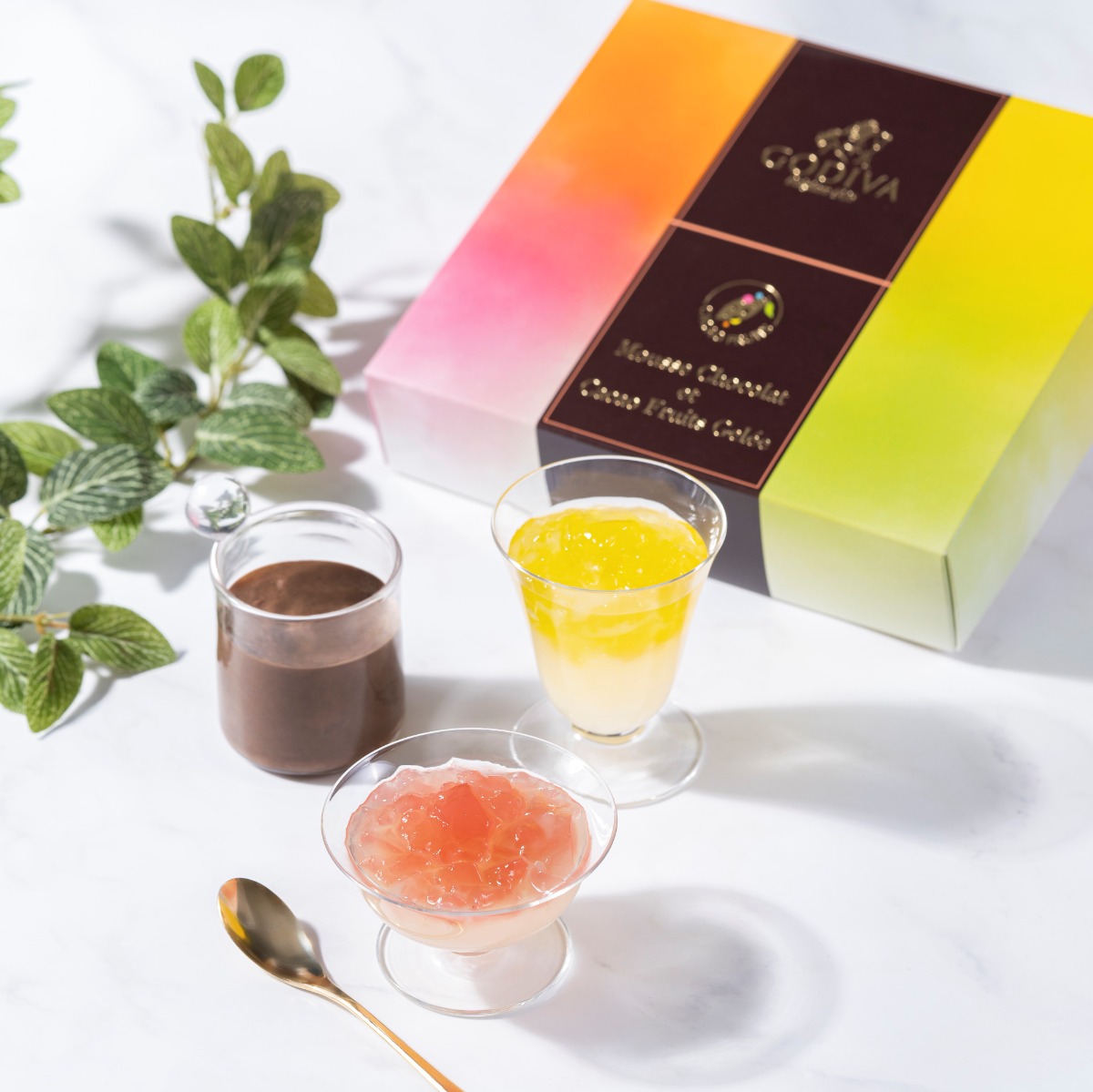 カカオの白い果肉部分から絞った果汁を使用し、みずみずしく爽やかな酸味が特徴のジュレに、食感の異なるカットゼリーを合わせた「カカオフルーツジュレ」(3種)と、上質なチョコレートを使用したなめらかな舌ざわりの「ムースショコラ」(2種)の詰め合わせ。常温保存可能です。