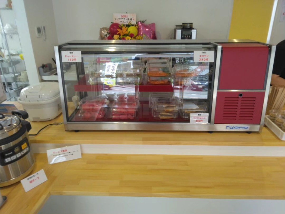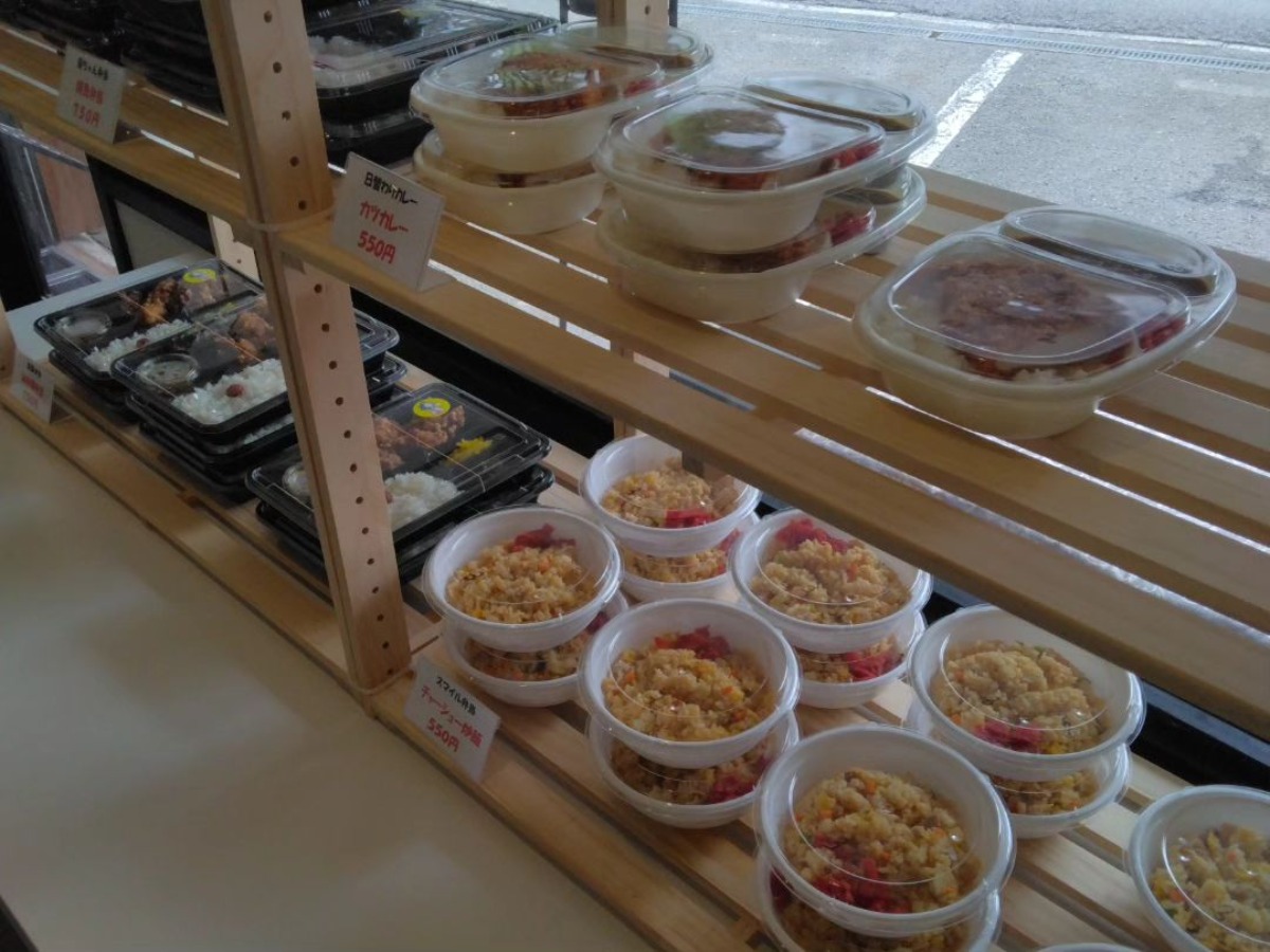 余っている材料や地元の野菜を無駄なく使用した日替わりの惣菜メニュー。酢豚やマカロニサラダ、八宝菜など豊富なメニューが並び、冷蔵ショーケースから好きな料理を好きな量だけ取る量り売りとなっています。