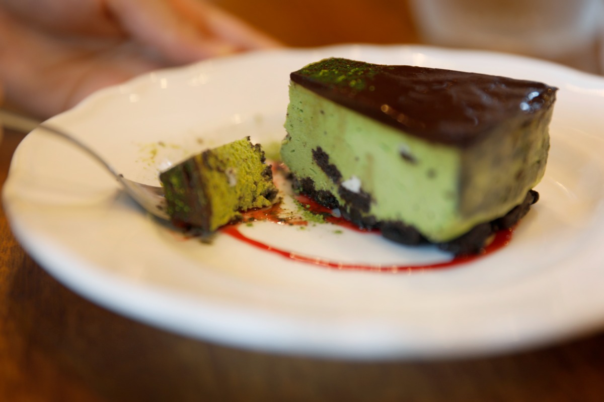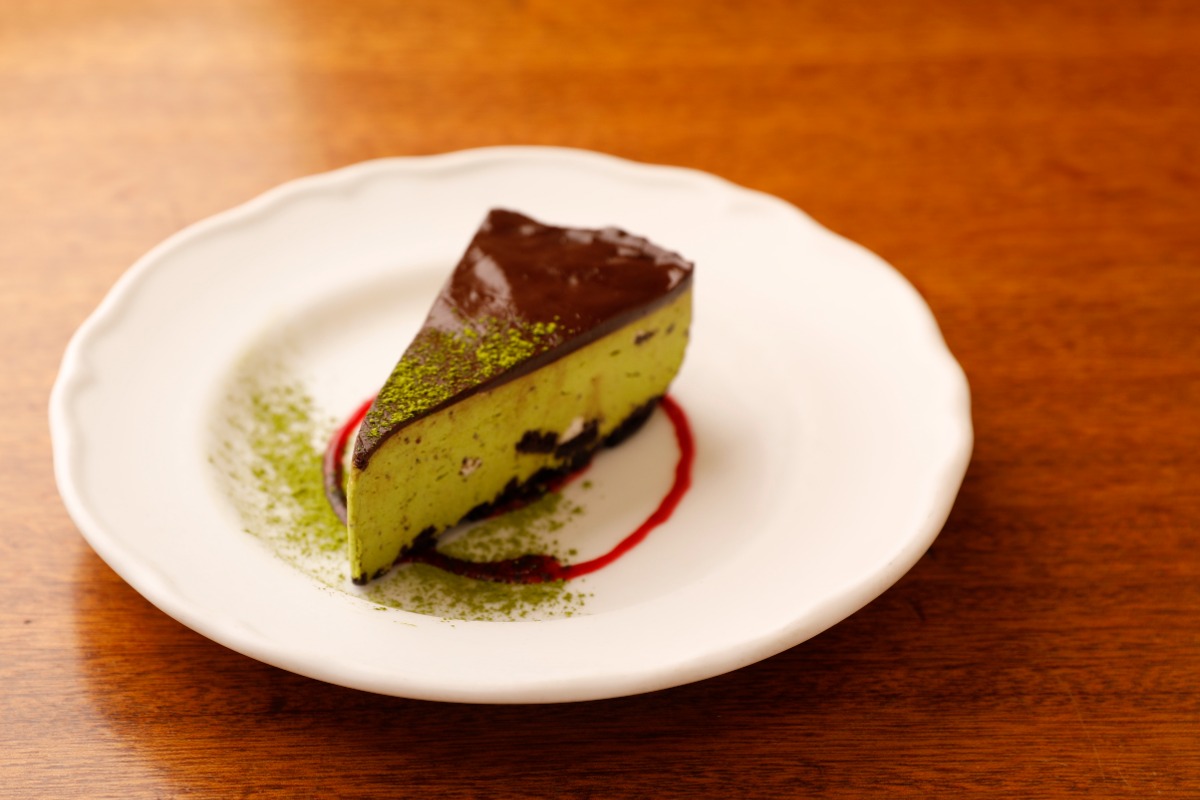 マルブンさんの夏のおすすめデザート「抹茶とオレオのレアチーズ」。ほんのり苦みのある抹茶と上にかかっている甘いチョコが絶妙のバランス!抹茶にはクリームチーズが入っているのでさっぱりしています。