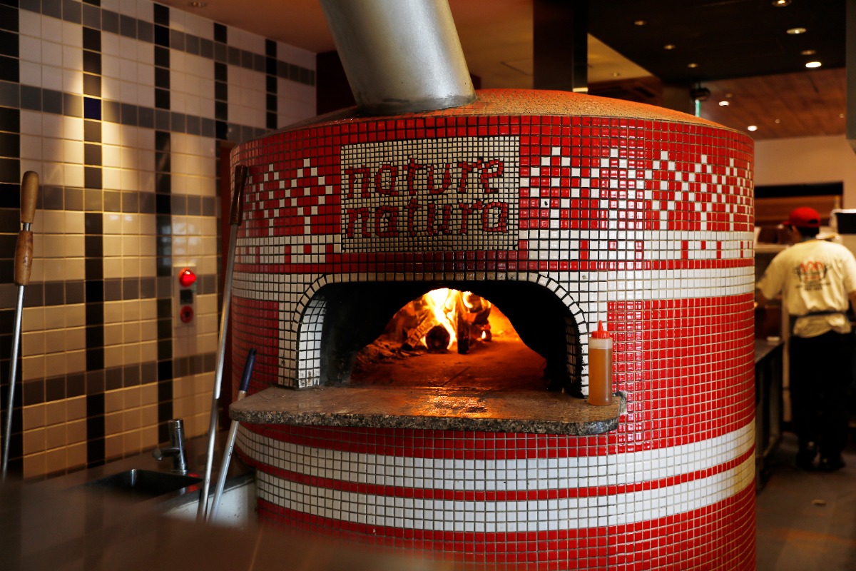 1階の中央部にある大きいピザ窯もポイント。薪でピザを焼くことで香ばしさが残り、外側の生地はパリッと、具材がのっている部分はふわっとした食感が味わえます。ピザの1番人気は内子産のプレミアムモッツァレラやトミーノチーズをのせた「プレミアムマルゲリータ“MAESTRO”」 (税込1,210円)です!