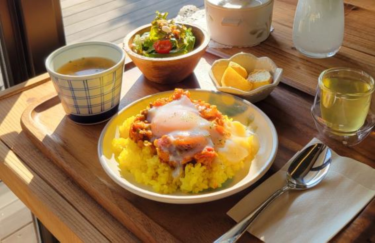 6種類以上の旬の野菜とミンチをゆっくり時間をかけて煮込んだキーマーカレーが大人気。トマトベースのあっさりとした味わいで、残暑が厳しい今の季節もさっぱりといただけます。辛さもほとんどなく、子どもも喜ぶ美味しさです。ルーと宇和米を使用したバターライスとの相性もばっちりです。上にのっている温玉を崩して食べてくださいね!
