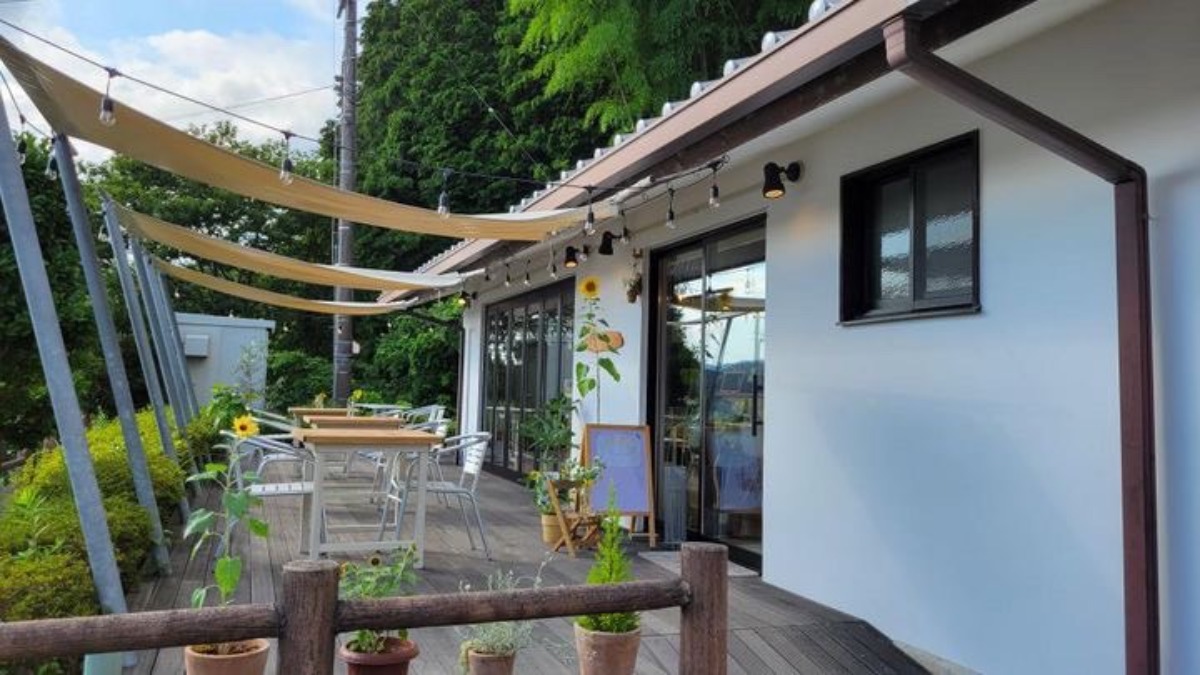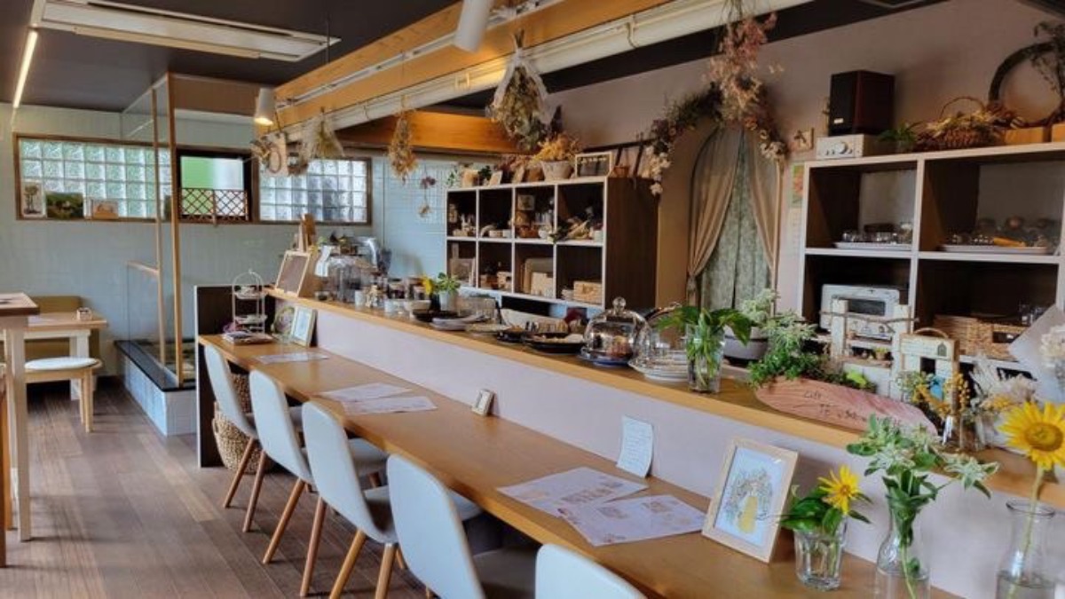 店主の描いた優しいタッチの絵が飾られ、生花やドライフラワーなどその時期の花々が咲き誇っている店内。窓からは、西予市ののどかな景色が楽しめます。ウッド調で温もりのあるテーブルとイスがあり、小さなお子さん連れもオッケー。カウンター席もあるので、ひとりでも気兼ねなく立ち寄れます。外にはテラス席もあり。