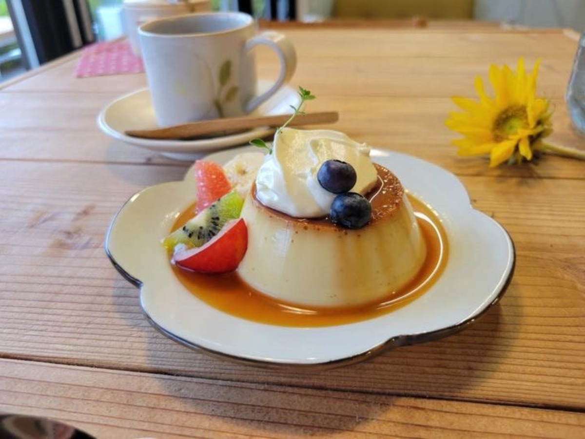 店主イチオシの手作りプリン。普段食べるプリンよりも固めで、甘めのカラメルソースと、砂糖が入っていない生クリームとのコラボレーションがクセになる味わい。旬のフルーツとハーブの葉っぱがトッピングされ見た目もキュート!