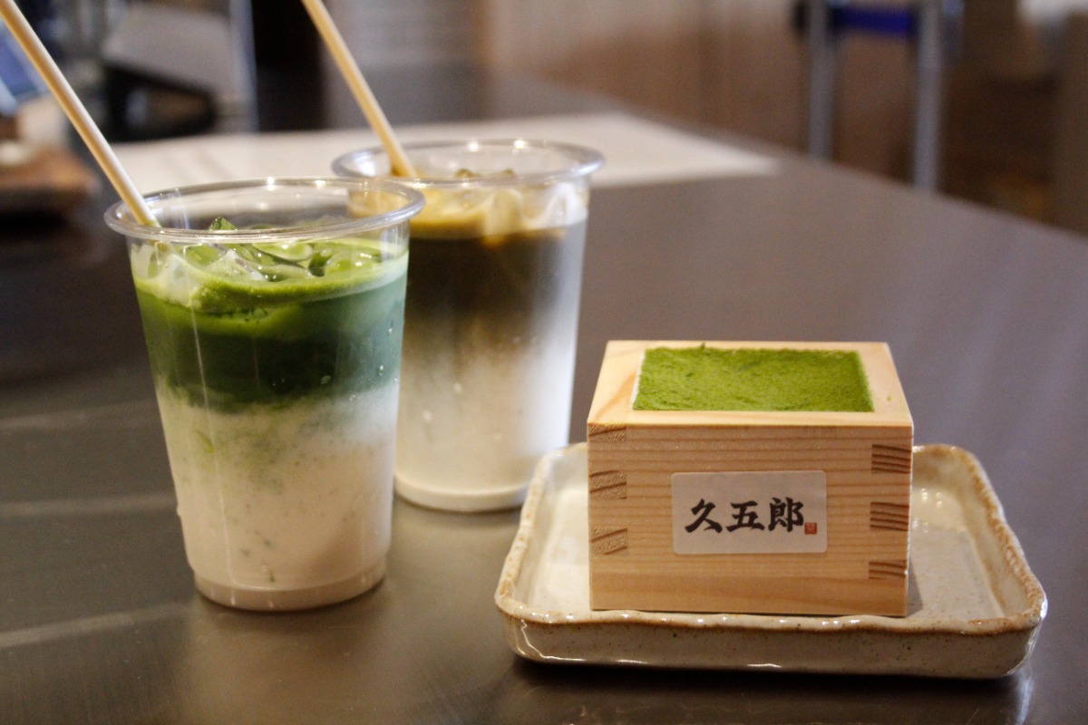 (写真:左から) 「抹茶ラテ」(700円)「ほうじ茶ラテ」(700円)「枡ティラミス(抹茶)」(600円)
