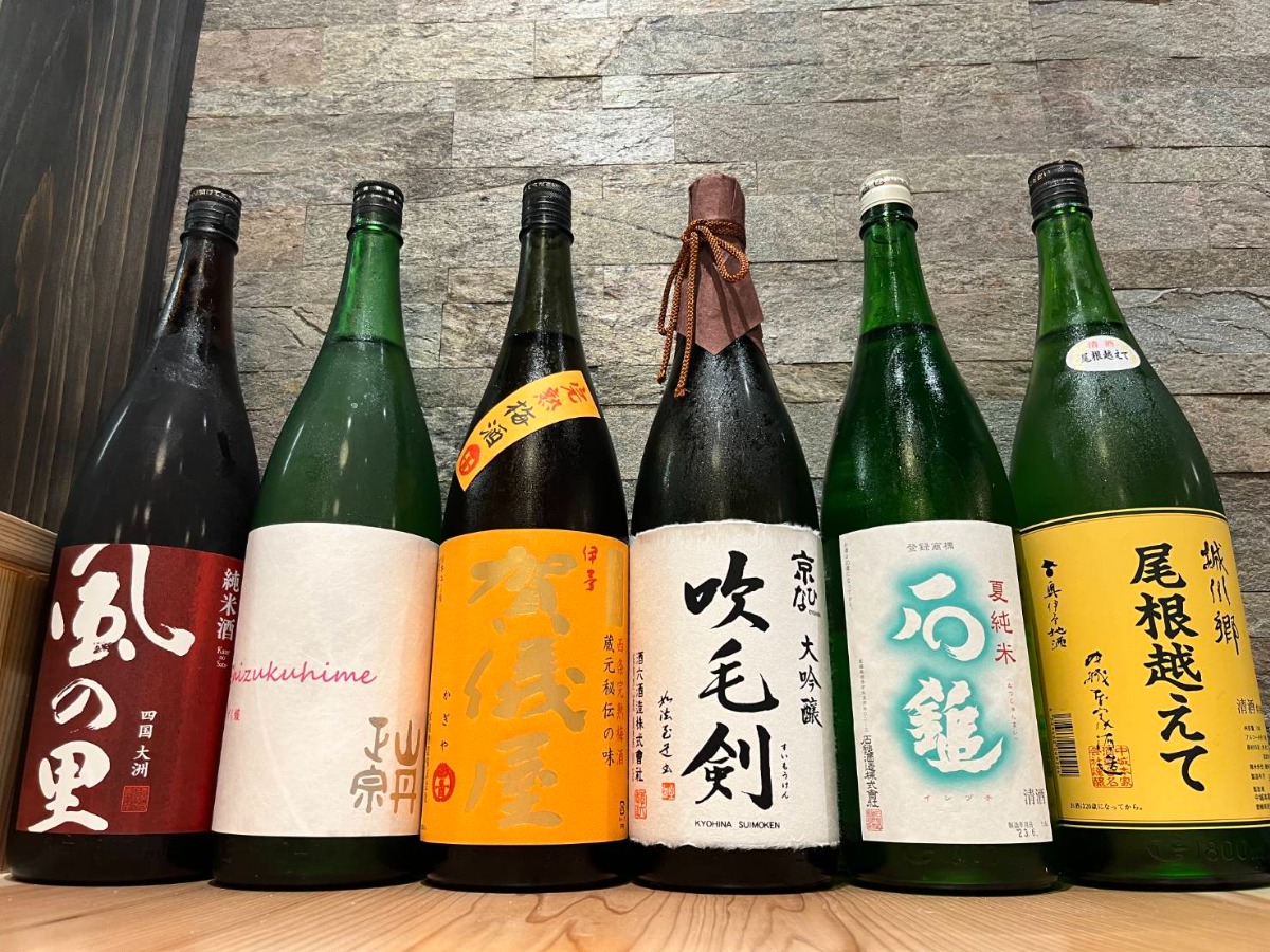 定番のビールやハイボールはもちろん、焼酎、果実酒、厳選したワイン、日本酒、愛媛のお酒も用意。ボトルワインは赤・白・スパーリングなど各種取り扱いあり。