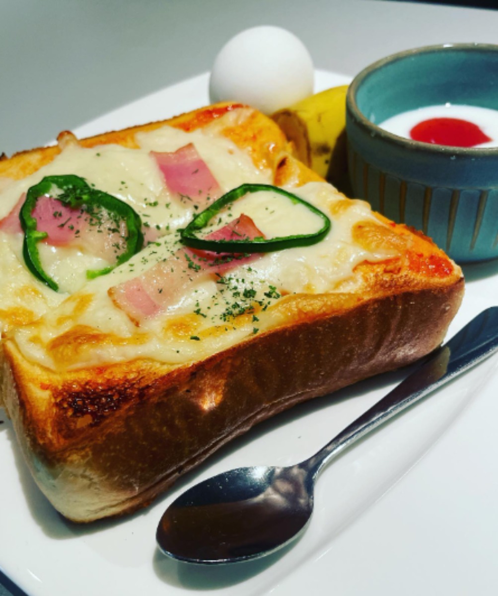 特に人気の「一本堂」の食パンを使用したピザトーストは、ボリューミーでモチモチ感のあるパンとたっぷりのチーズがトッピングされた自慢の逸品。