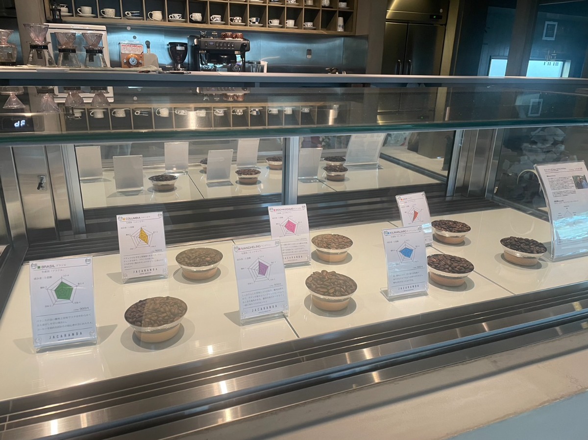 コーヒー豆は15℃~18℃のショーケースに入れて管理されています。直接の光をさけて管理されているので、新鮮な美味しさが保たれています!