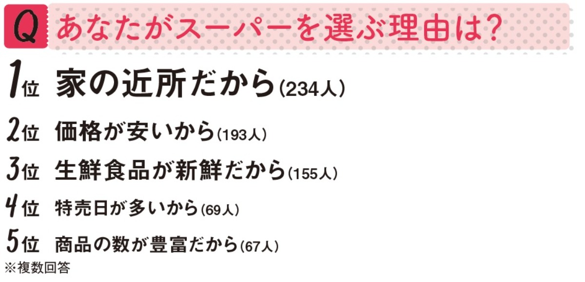 今回330人のみなさんに「スーパーマーケットを選ぶ理由」についてアンケートをとってみました。結果がこちらです!