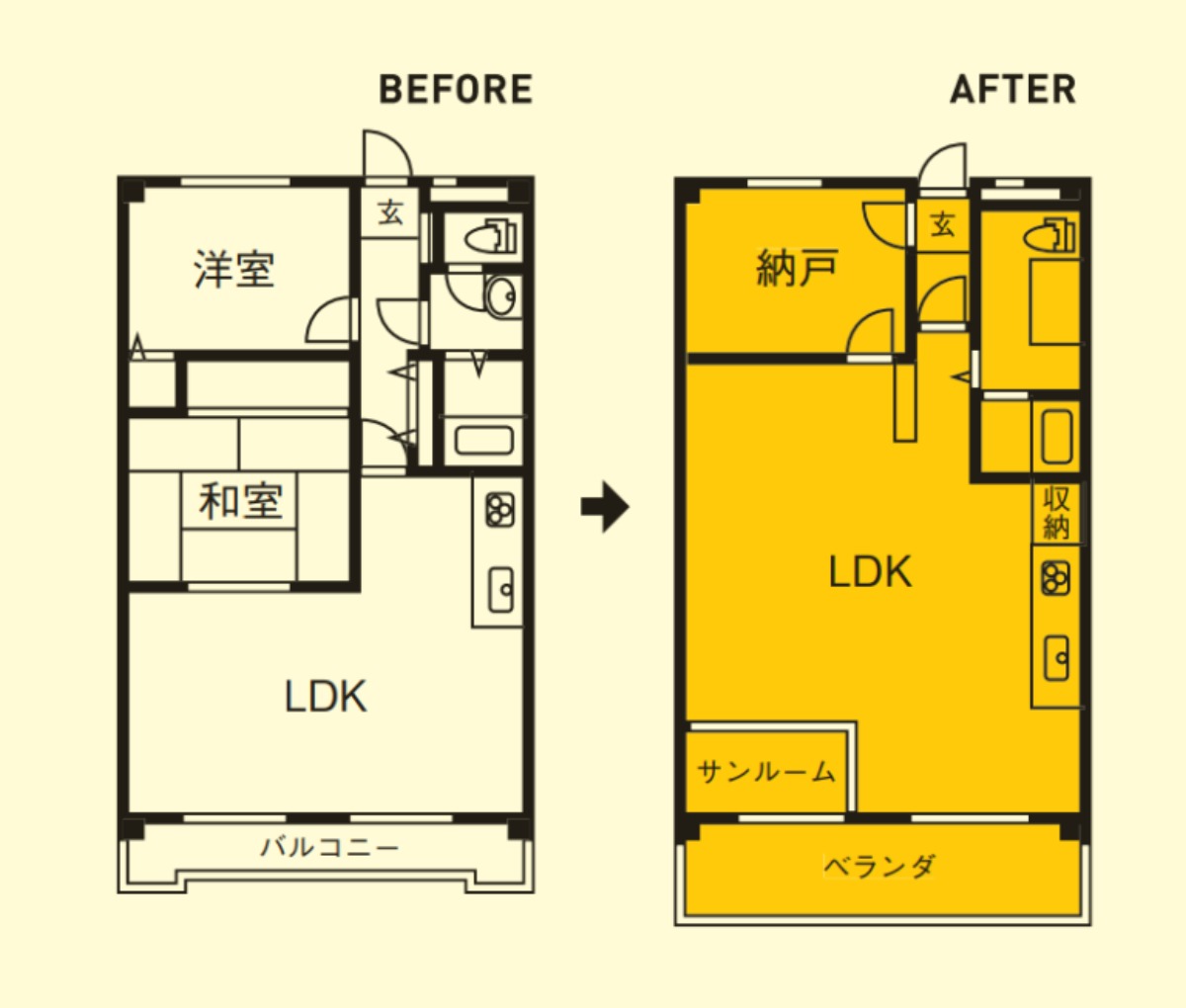 まず2LDKの間仕切りを撤去して1LDKの広々ワンフロアへとチェンジ。
