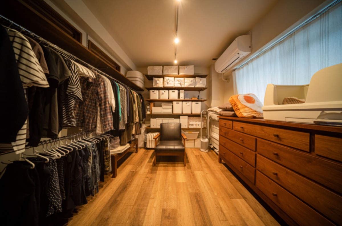 ネコが入れないように配慮した納戸はLDKにも玄関にもつながる回遊動線になっていて、施主さんが買ったものを直接運び込むことができます。