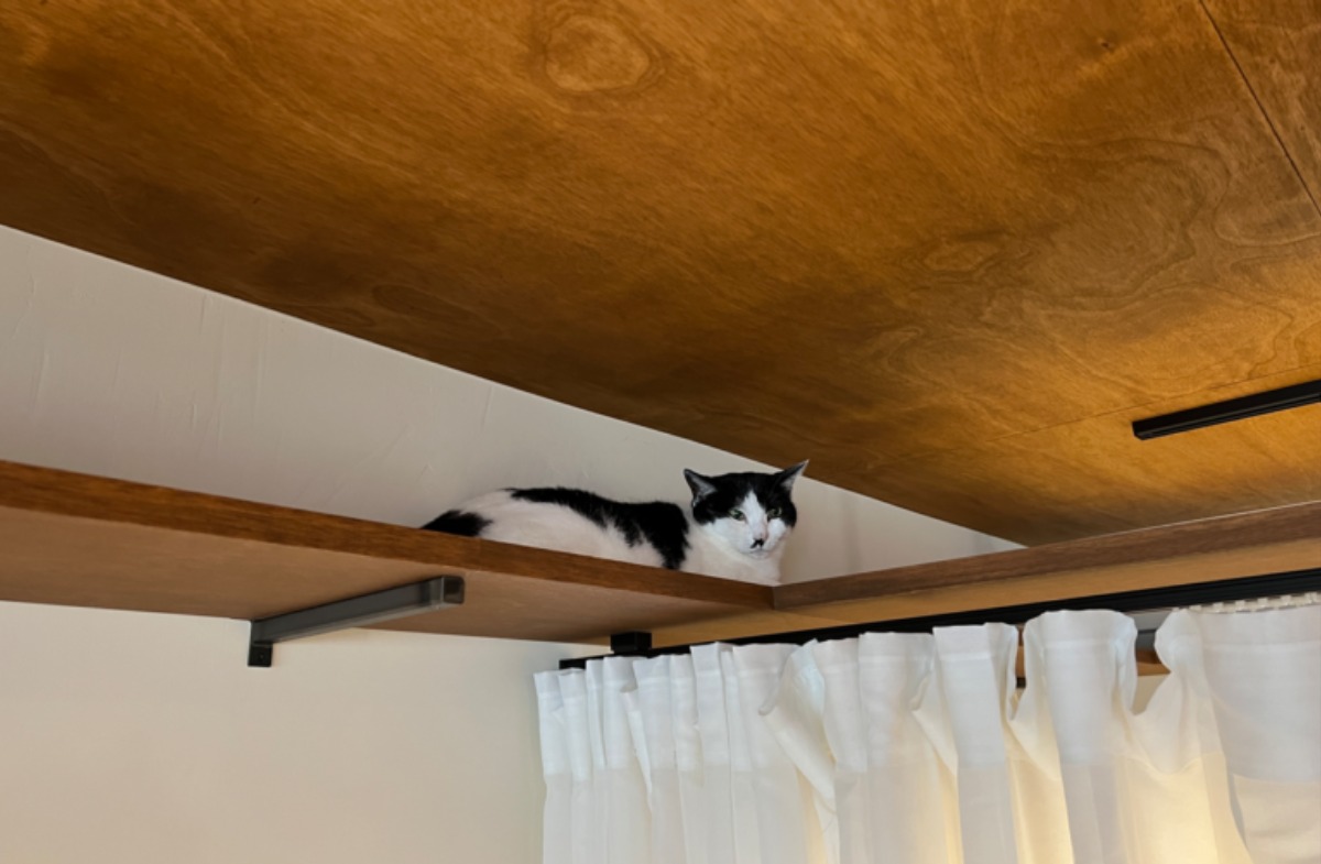 天井に沿って8の字に回遊できるキャットウォークは、空間にしっくり馴染むように設計され、ネコも人もくつろぐことができる空間が完成しました。