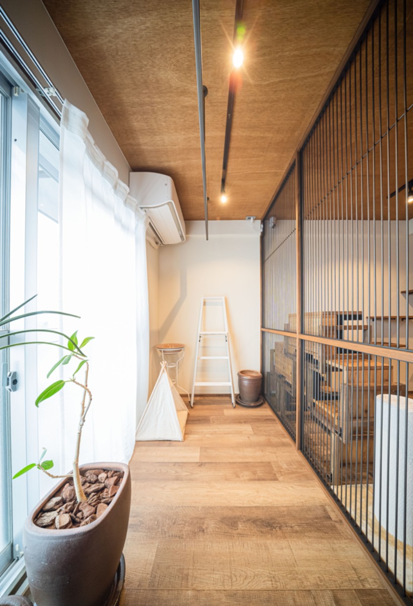 ベランダ側にアイアン格子の間仕切りをあしらい、室内干しができるサンルームスペースを確保。