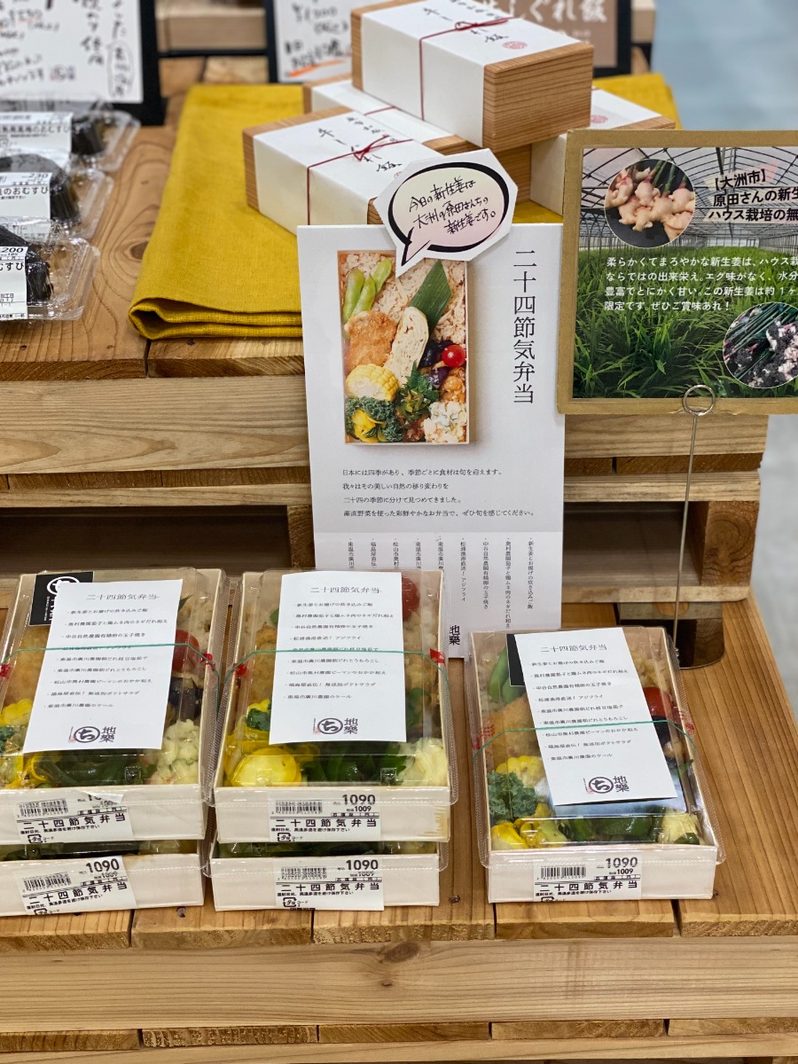 「中谷自然農園」の玉子や愛媛県の農家の方直送の新鮮野菜・コシヒカリを使用している「二十四節気弁当」。