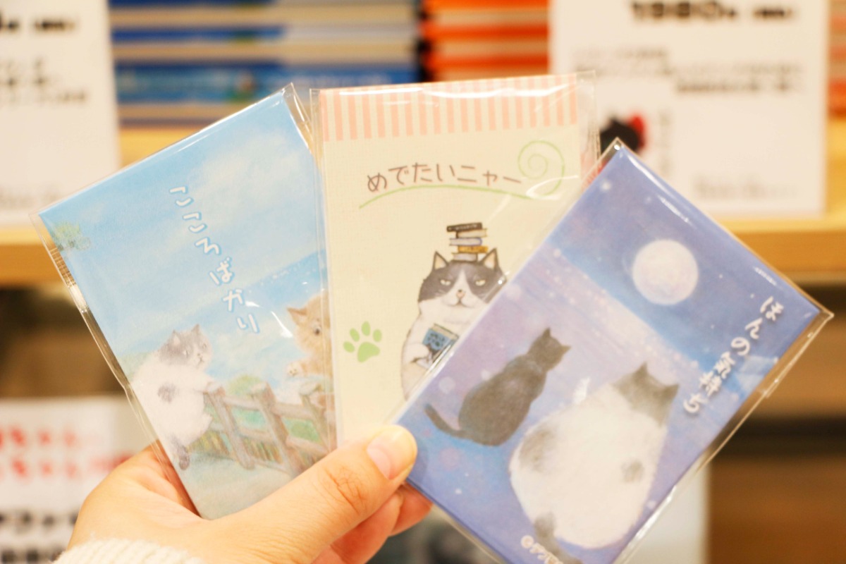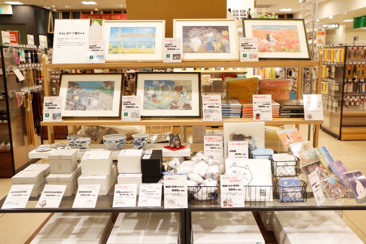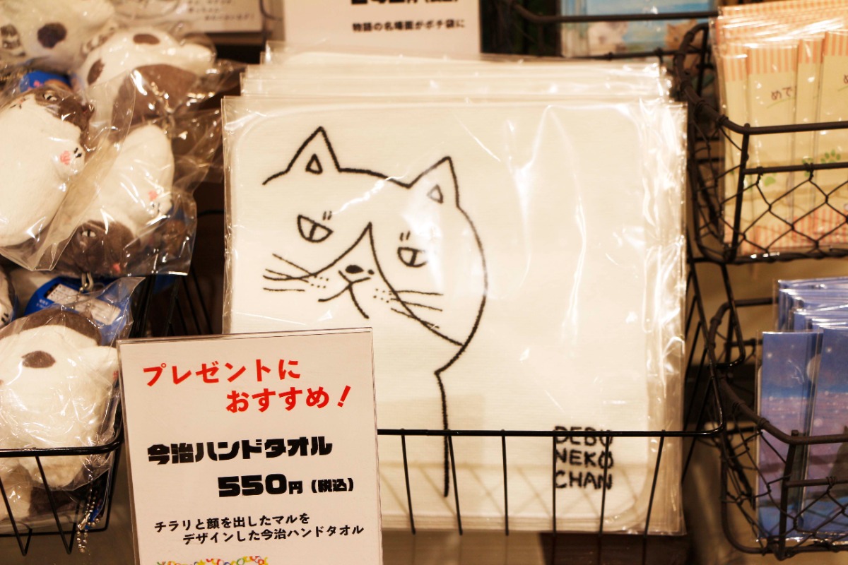 「ハンズ松山店」ではインテリアにもおすすめなポストカードや、今治ハンドタオルなど「かなしきデブ猫ちゃん」グッズを販売中です!