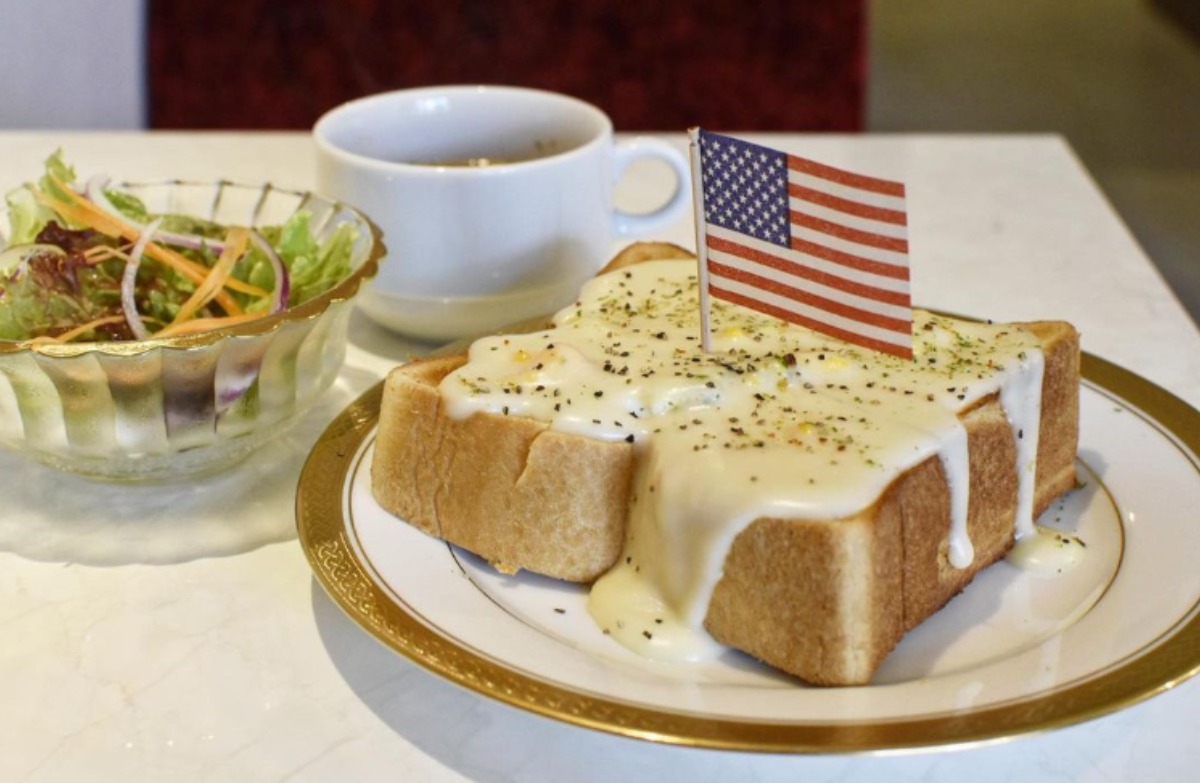 厚切りトーストに、下味を付けたたまごとホワイトソース、チーズがたっぷりのっている贅沢な逸品です!アメリカ国旗も可愛いですよね。