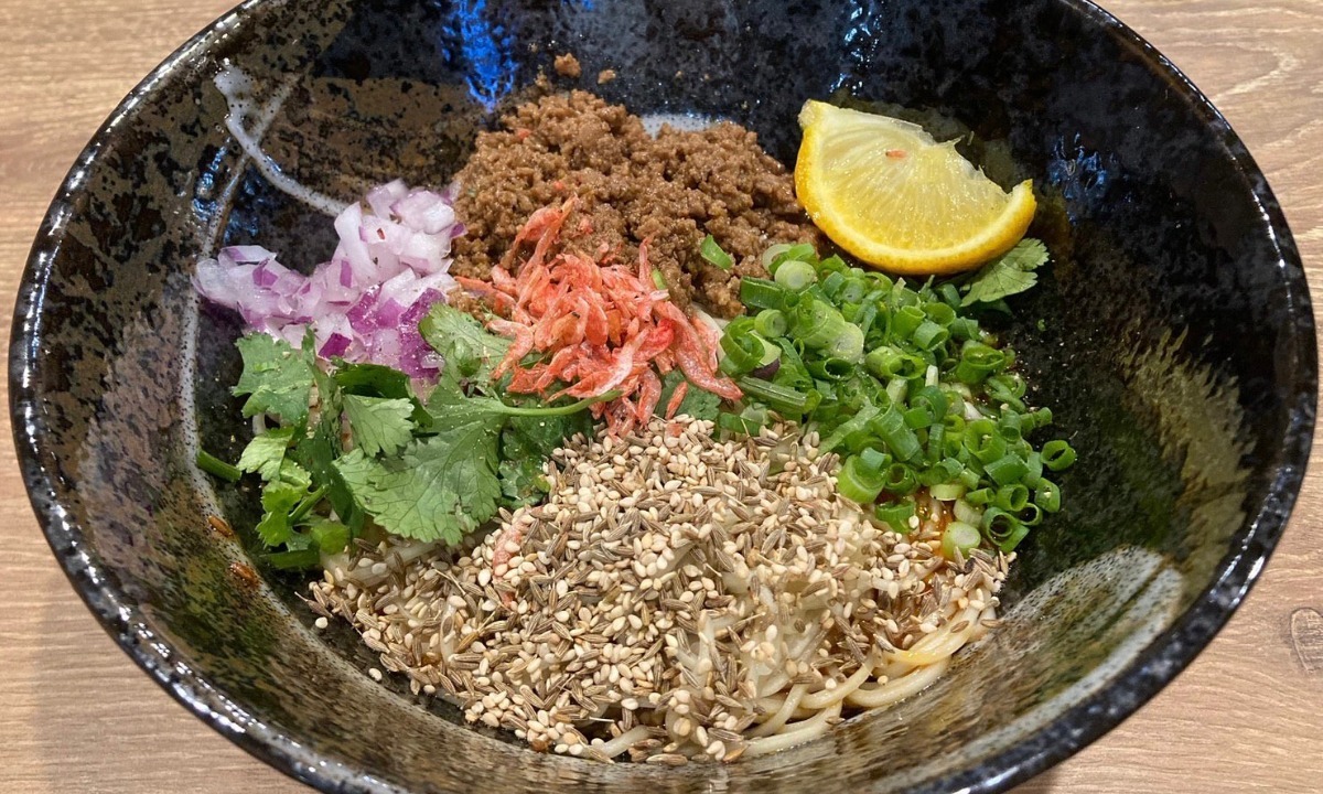 愛媛ではまだ少ない「スパイス汁なし坦々麺」の専門店。6種のスパイスと愛媛の旬の柑橘がミックスされエスニック料理好きにはたまらない味わい。最後に「混ぜご飯」を入れて食べるのも◎。月に数回の営業日はInstagramで要チェック!