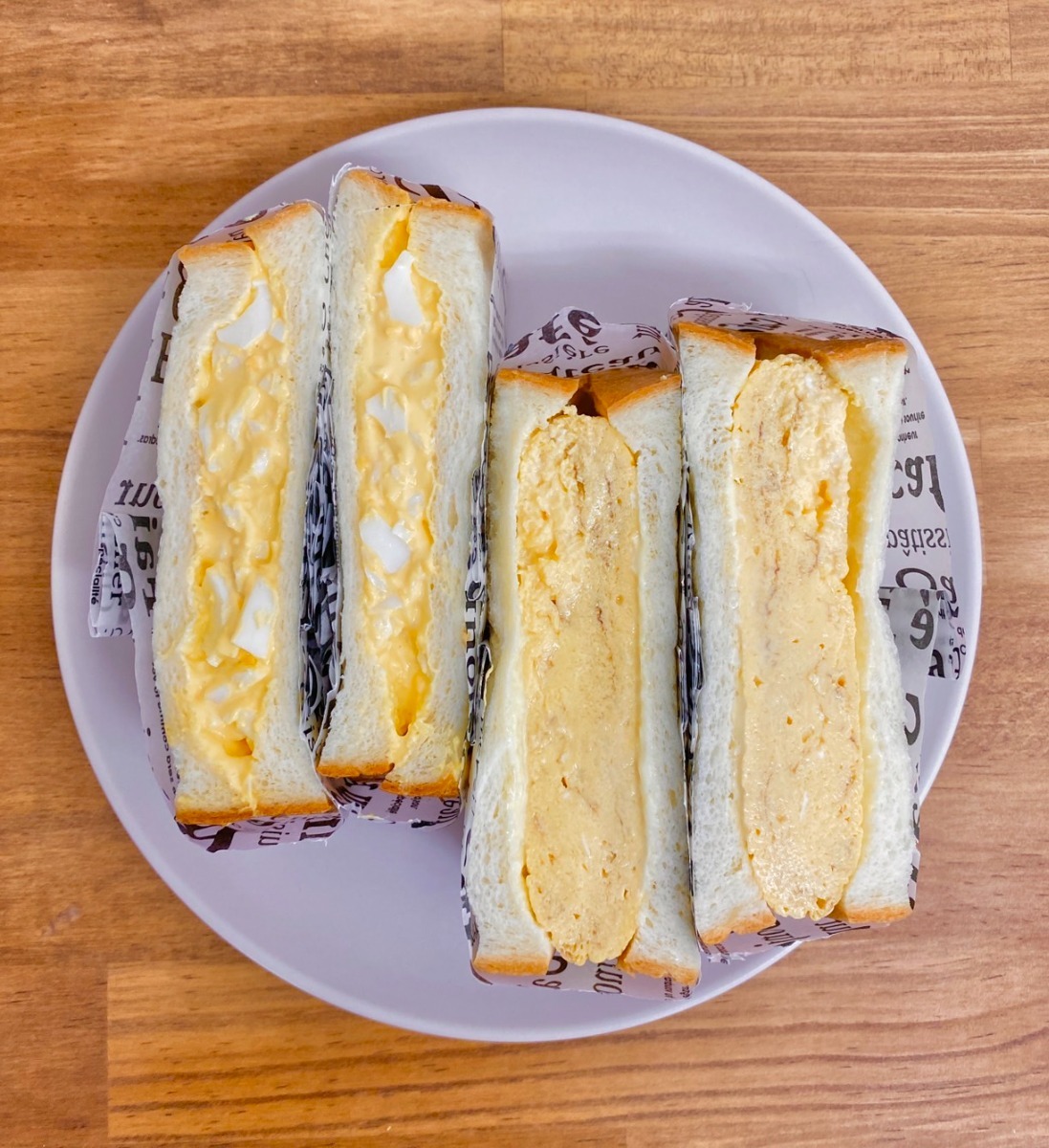タマゴの黄身の濃厚な味が特徴の「タマゴサンド」。素朴な味で子どもから大人まで愛される一品。また、厚さ4㎝の厚焼きタマゴが入ったサンドは、甘めの味で懐かしさを感じる味。