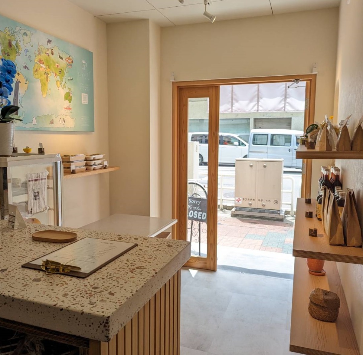 和の雰囲気を醸し出す木目調の店内。そこに海外で人気のテラゾー素材を掛け合わせることで、日本と海外の調和を感じさせてくれる空間になっています。